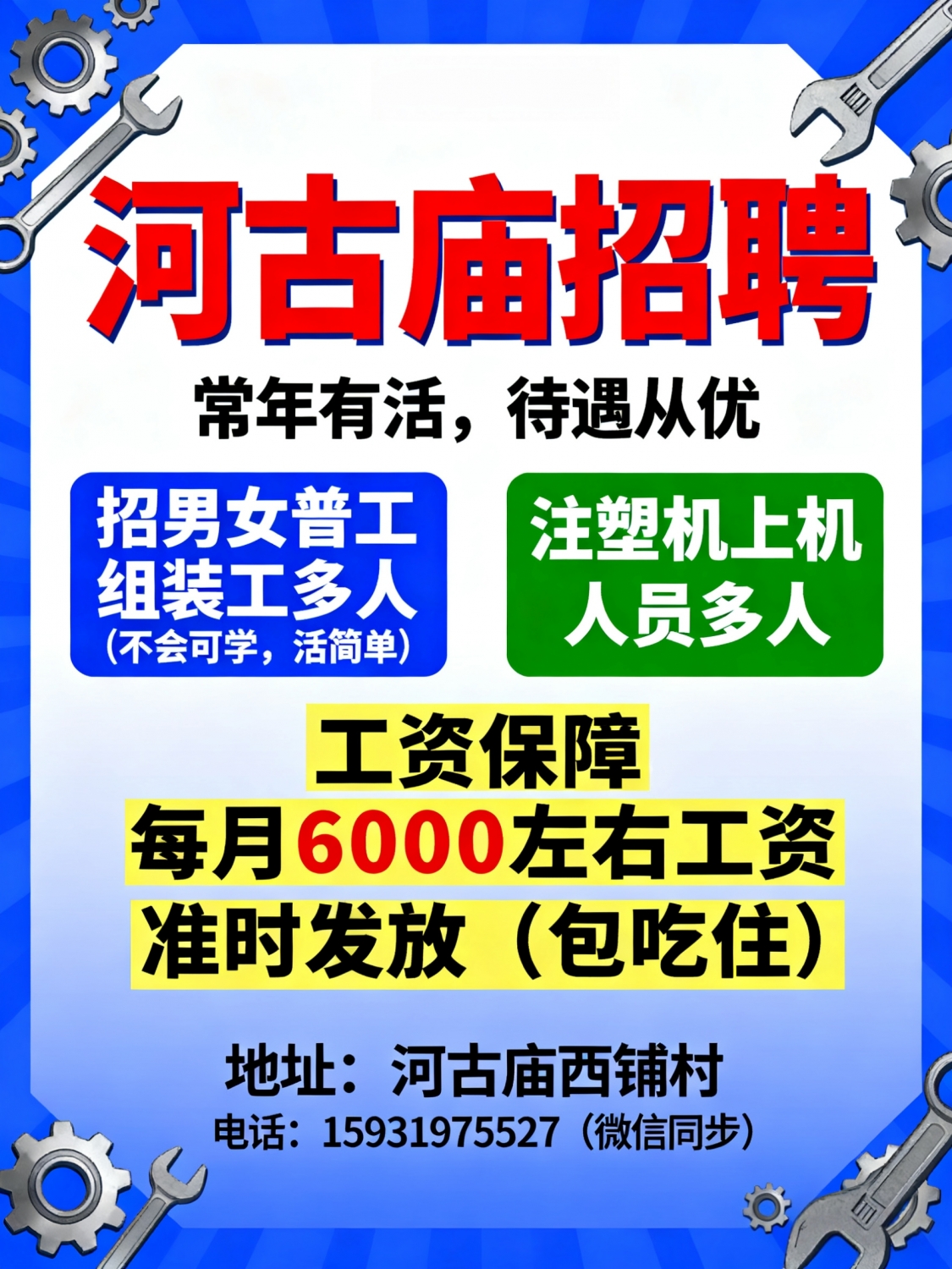河古庙招男女普工组装工多人不会可学,活简单注塑机上机人员多名工资保障,常年有活每月6000左右,工资准时发放(包吃住)地址:河古庙西铺村电话:*****5527(微信同步)