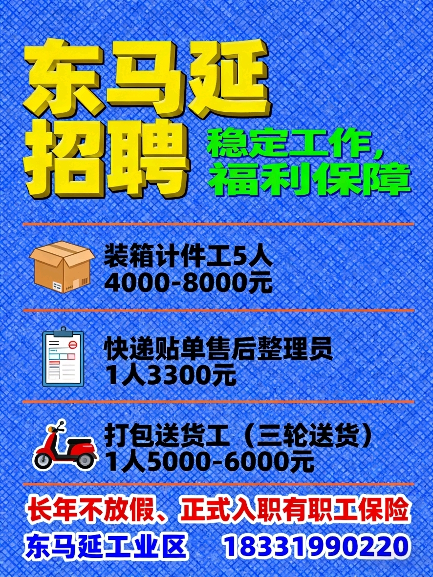 东马延【招聘】装箱计件工5人4000-8000元快递贴单售后整理员1人3300元,打...