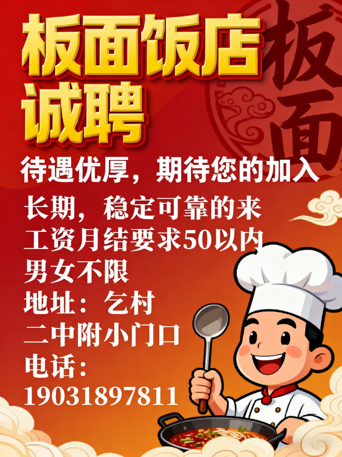 招聘板面饭店招工长期,稳定可靠的来工资月结要求50以内,男女不限电话:19...
