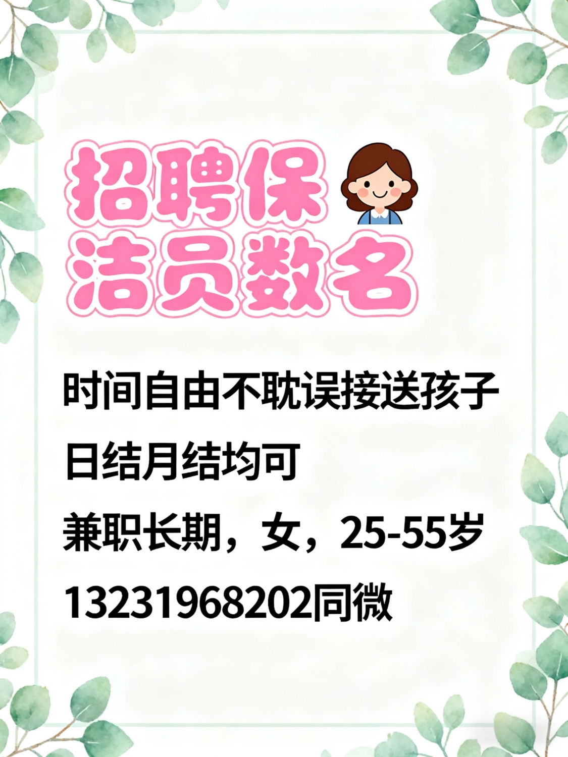 招聘保洁员数名,时间自由不耽误接送孩子日结月结均可,兼职长期要求:女,...