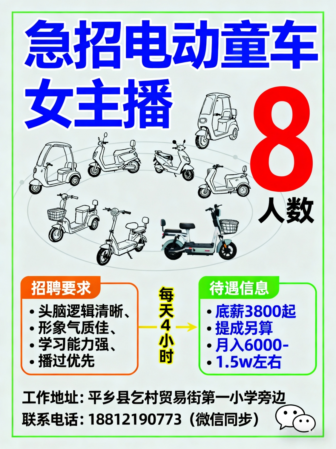 急招8名电动童车女主播头脑逻辑清晰,形象气质佳学习能力强,播过优先聘用...