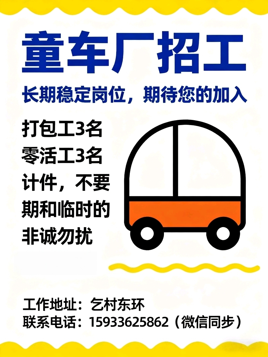 童车厂招工打包工3名零活工3名计件工资,多劳多得不要短期和临时的非诚勿扰工作地址:乞村东环联系电话:*****5862(微信同步)