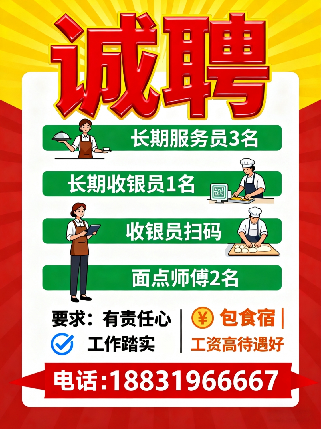 诚聘 [庆祝][庆祝][庆祝]1️⃣长期服务员3名2️⃣长期收银员1名3️⃣面点师...