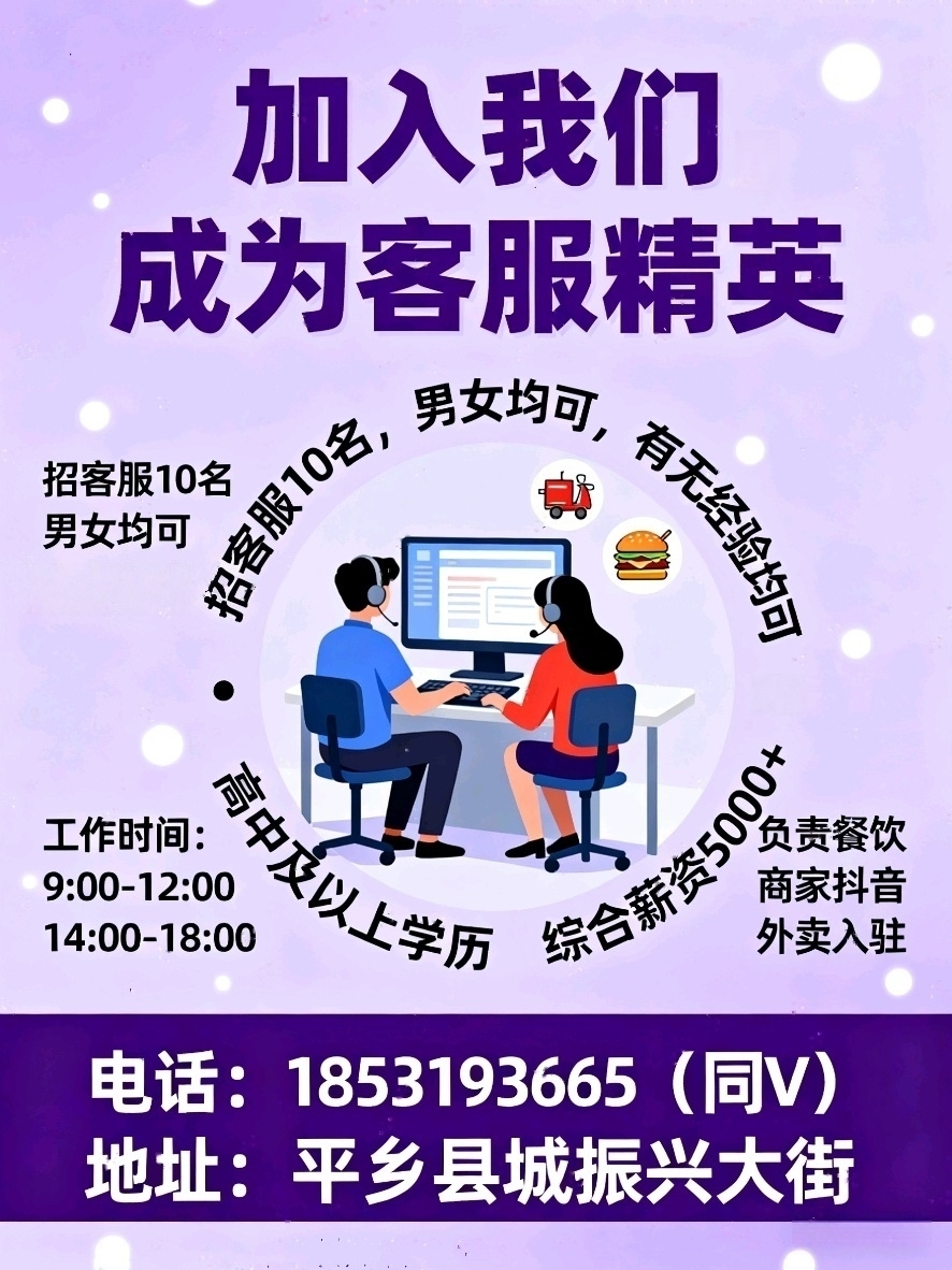 招聘客服10名,男女均可有无经验均可高中及以上学历负责联系餐饮商家入驻抖...