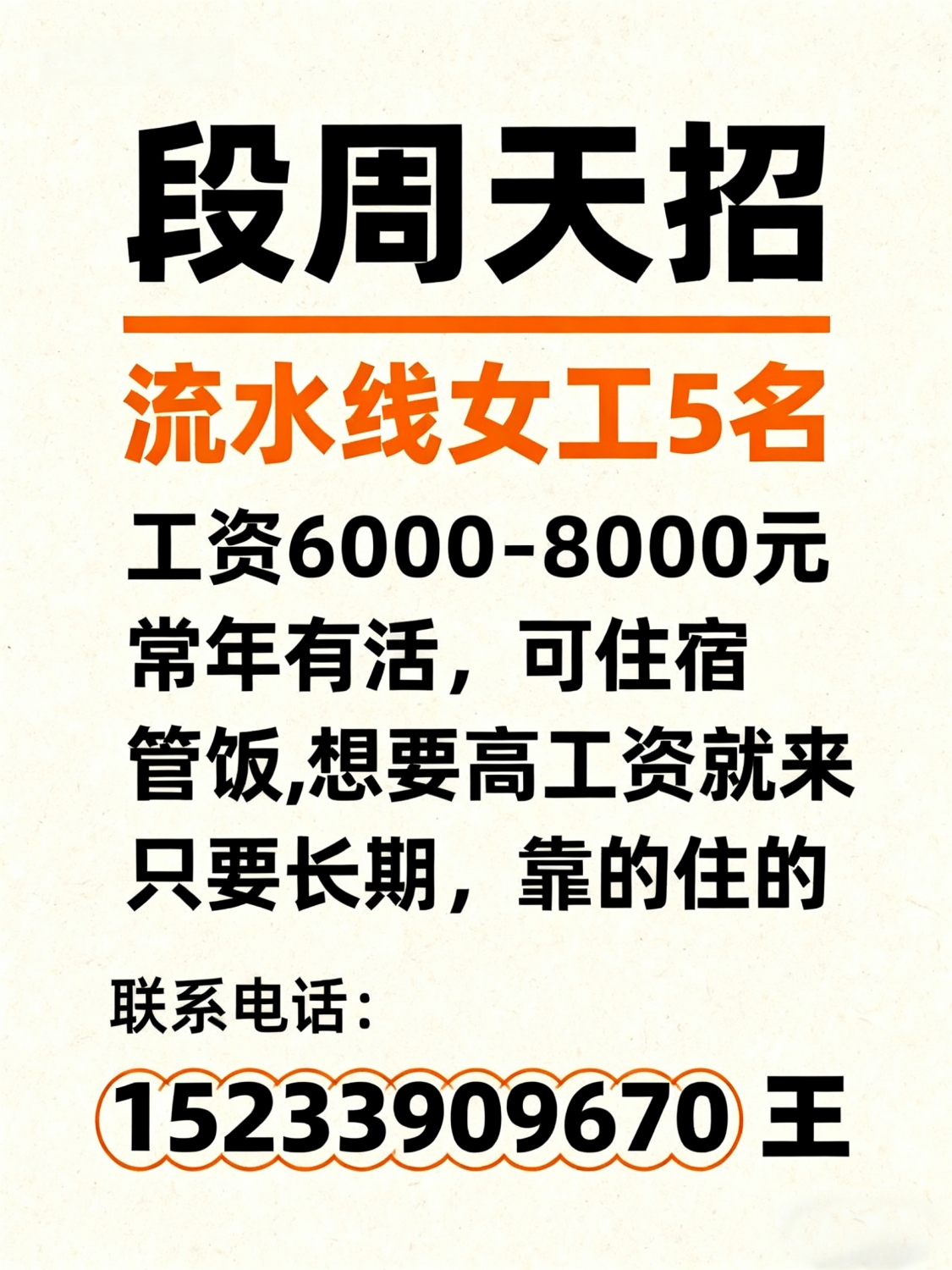 招聘段周天招流水线女工5名工资6000-8000元常年有活,可住宿,管饭想要高工...