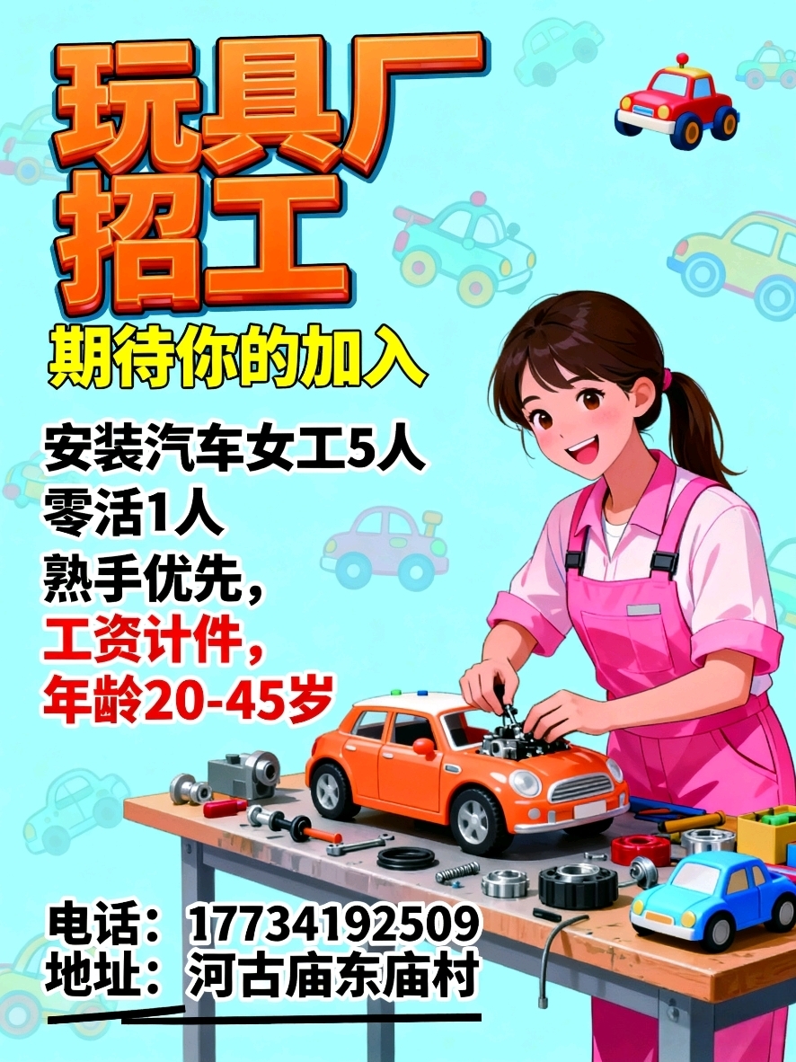 玩具厂招工 安装汽车女工5人零活1人,熟手优先工资计件,年龄20-45岁电话...