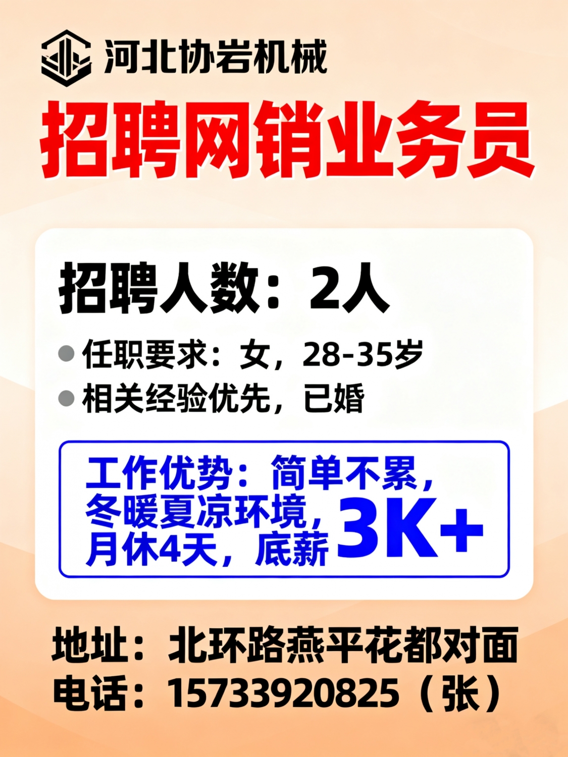 招聘网销业务员2人要求:女28-35岁左右已婚,干过的优先工作简单不累,冬暖...
