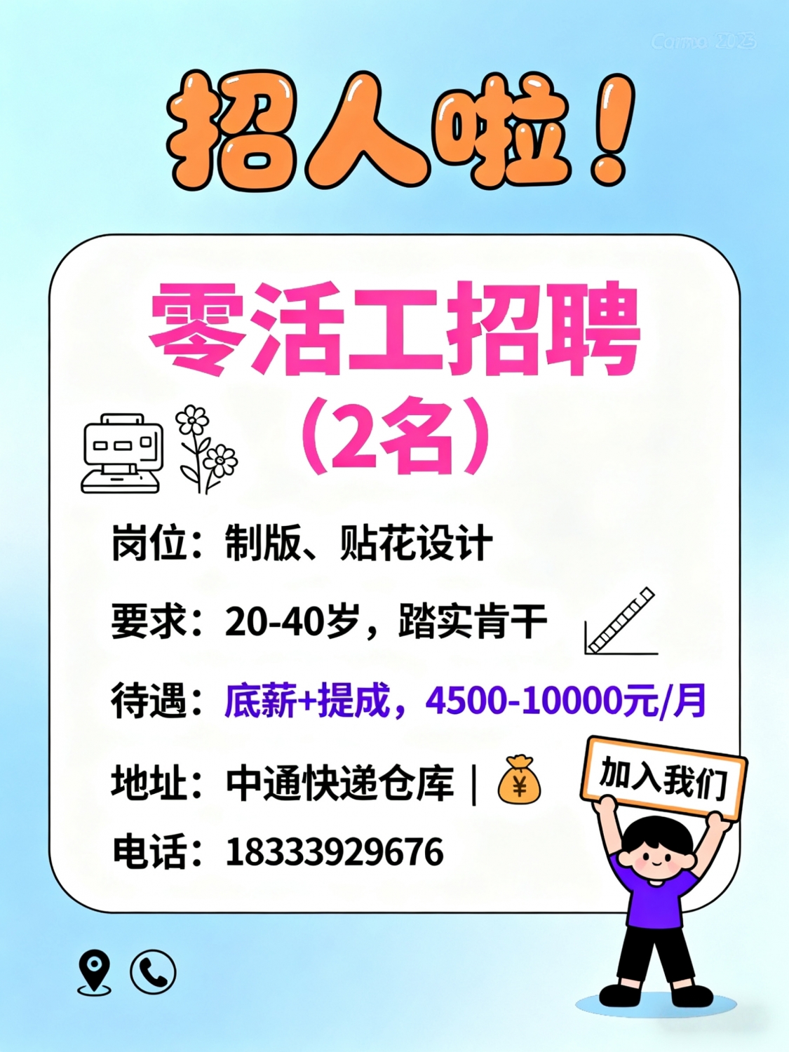 招聘岗位制版和贴花设计零活工两名要求(年龄20-40)待遇底薪加提成工资:4...