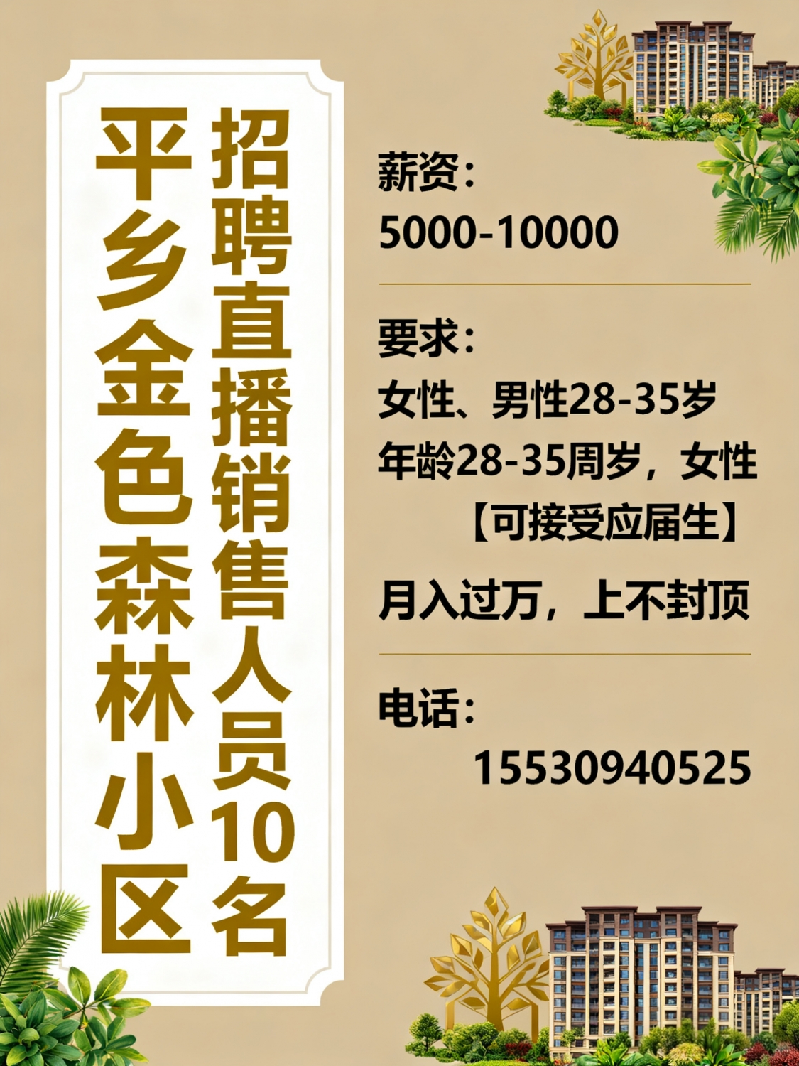 平乡金色森林小区招聘直播销售人员10名男女均可年龄28-35周岁女性【可接受...