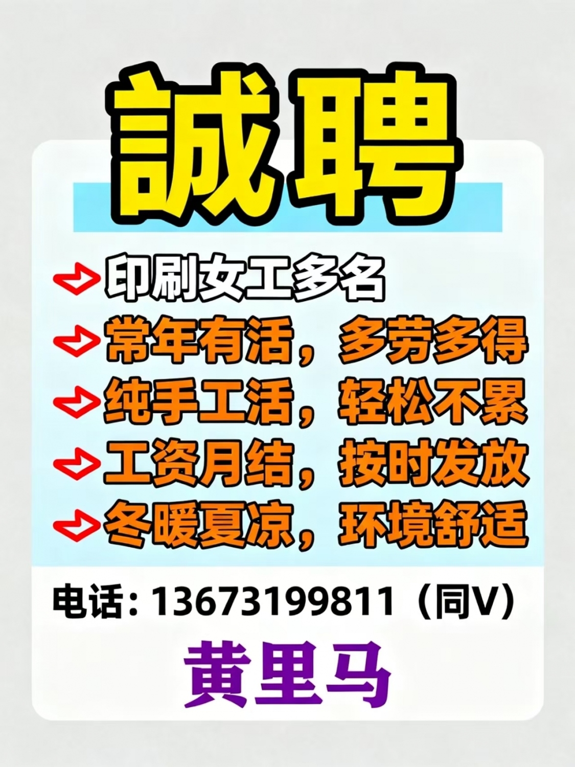 【誠聘】✅印刷女工多名✅常年有活,多劳多得✅纯手工活,轻松不累✅工资月结,按时发放✅冬暖夏凉,环境舒适*****9811(同V) 黄里马