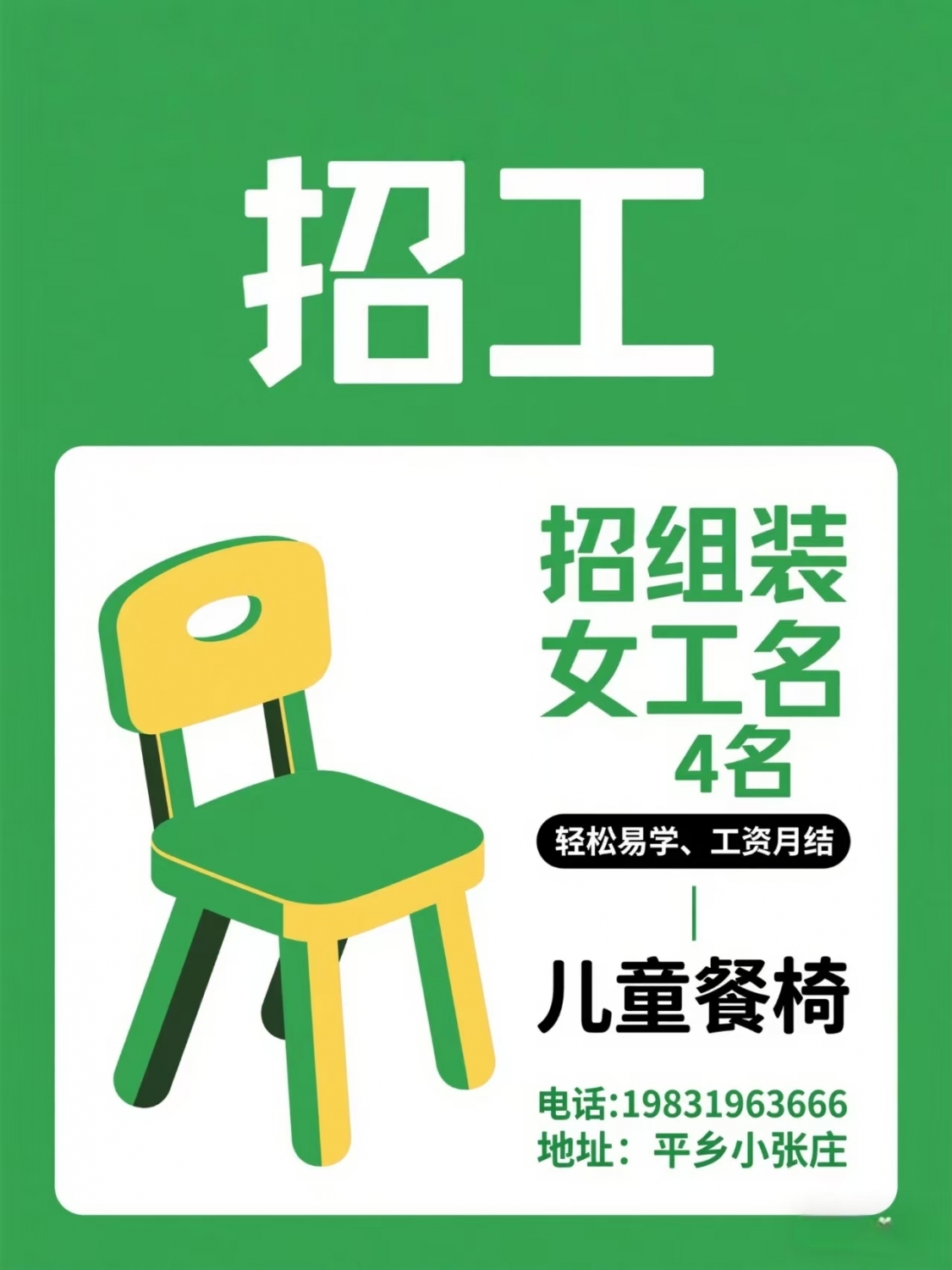 【招工】儿童餐椅✅招组装女工4名✅轻松易学工资月结电话:*****3666地址:平乡小张庄