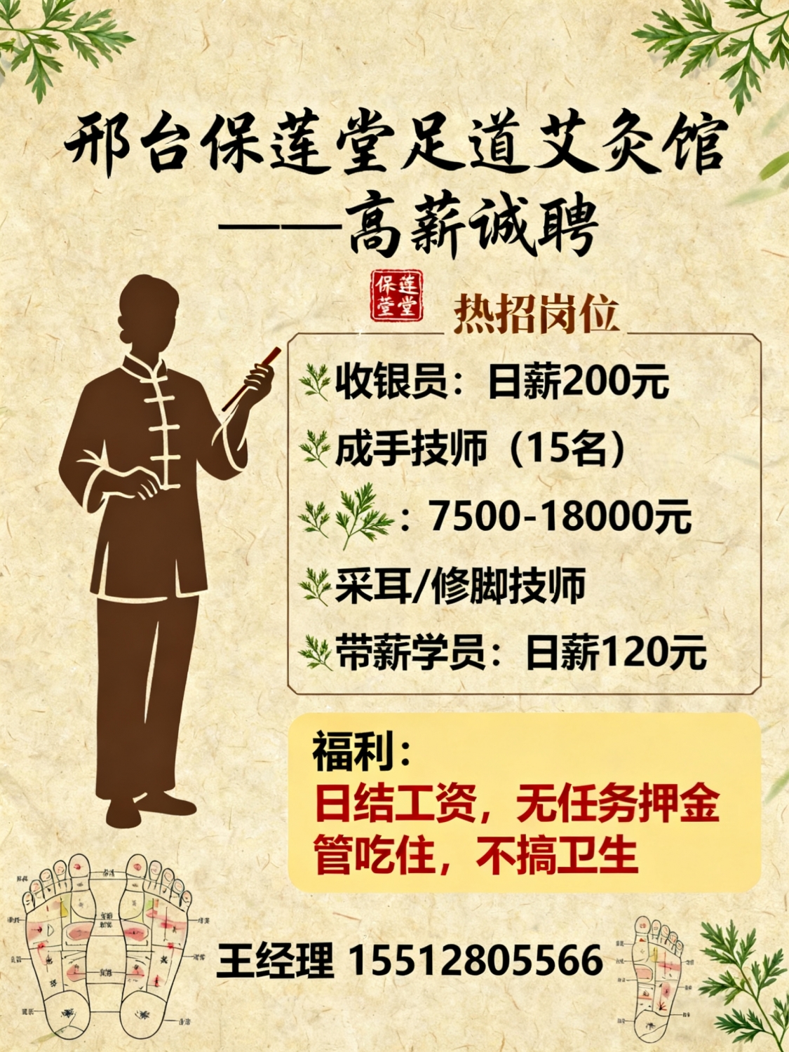 邢台保莲堂足道艾灸馆高薪诚聘收银员 日薪200元成手男、女技师工 15名,工...