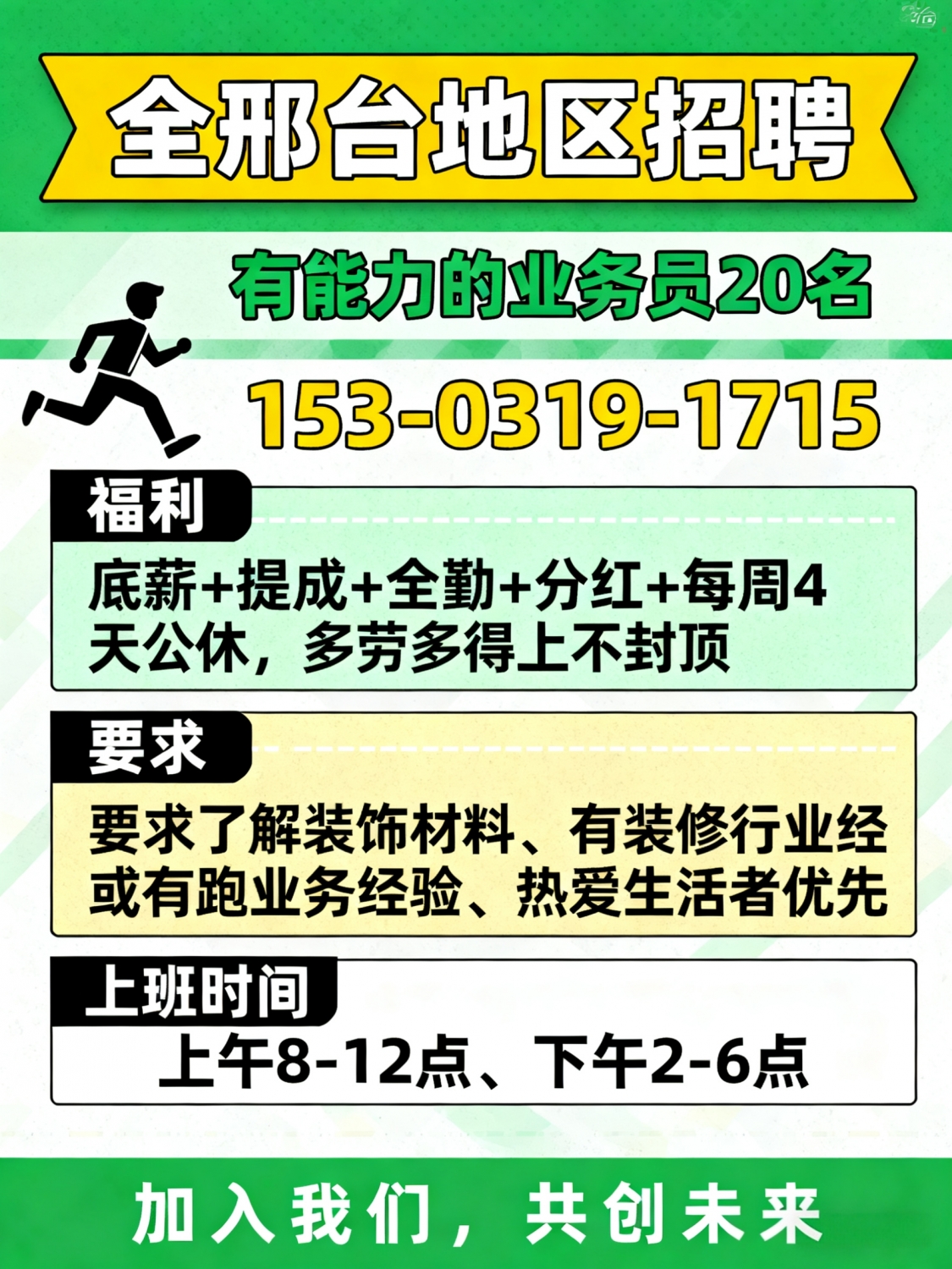 全邢台地区招聘有能力的业务员20名底薪+提成+全勤+分红+每周4天公休多劳多...