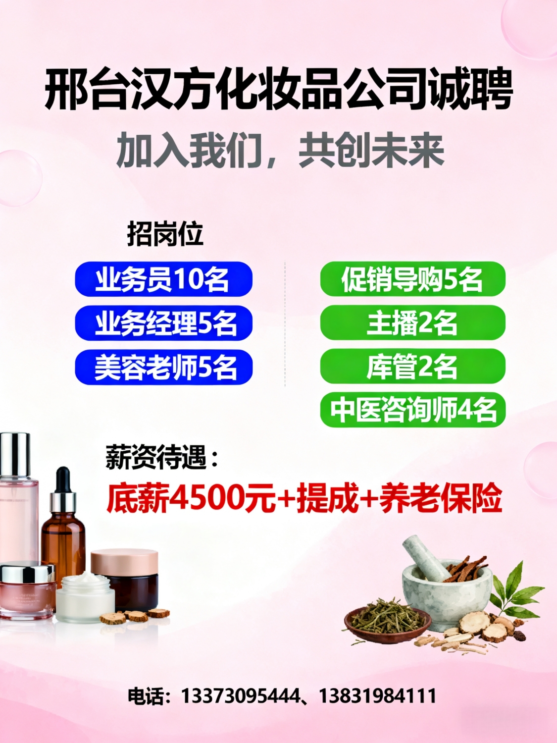 邢台汉方化妆品公司诚聘业务员10名业务经理5名美容老师5名促销导购5名主播2...