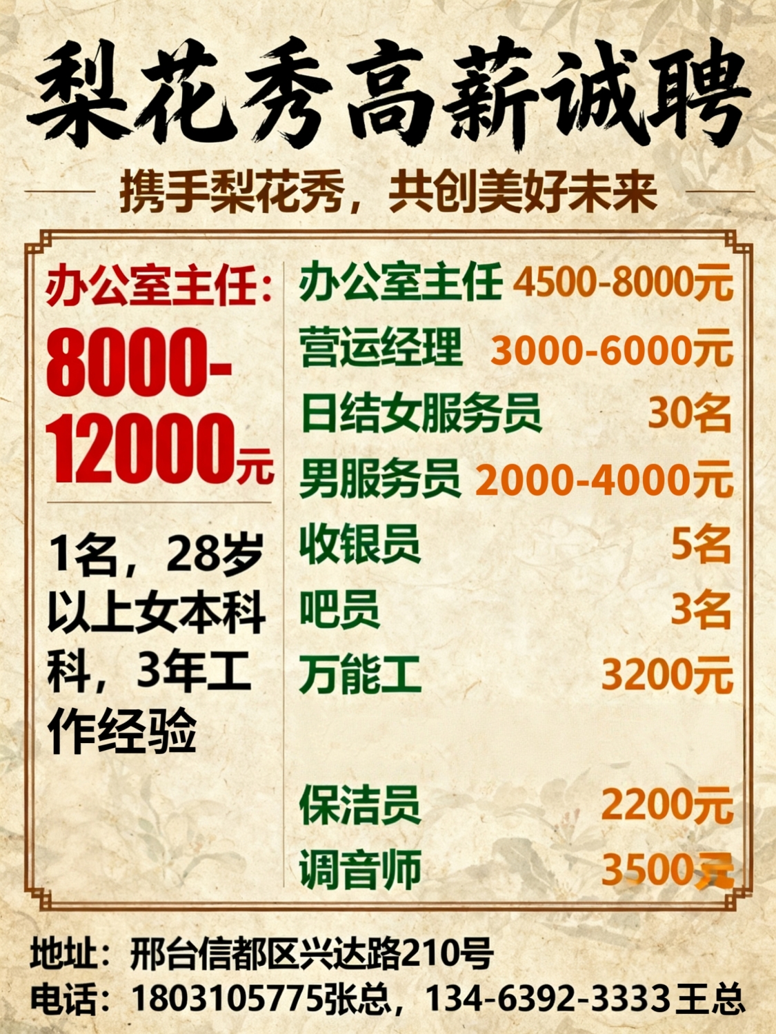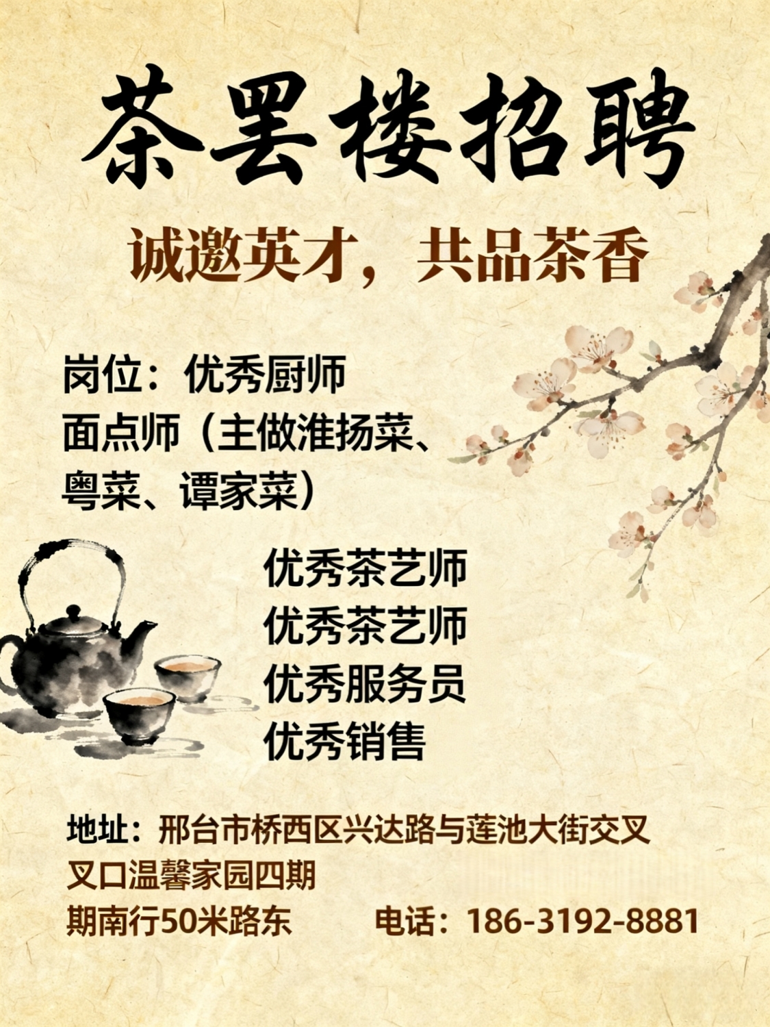 茶罢楼招聘优秀厨师面点师主做淮扬菜、粤菜、谭家菜优秀茶艺师优秀服务员优秀销售经理众筹合伙人电话:*****8881地址:邢台市桥西区兴达路与莲池大街交叉口温馨家园四期南行50米路东