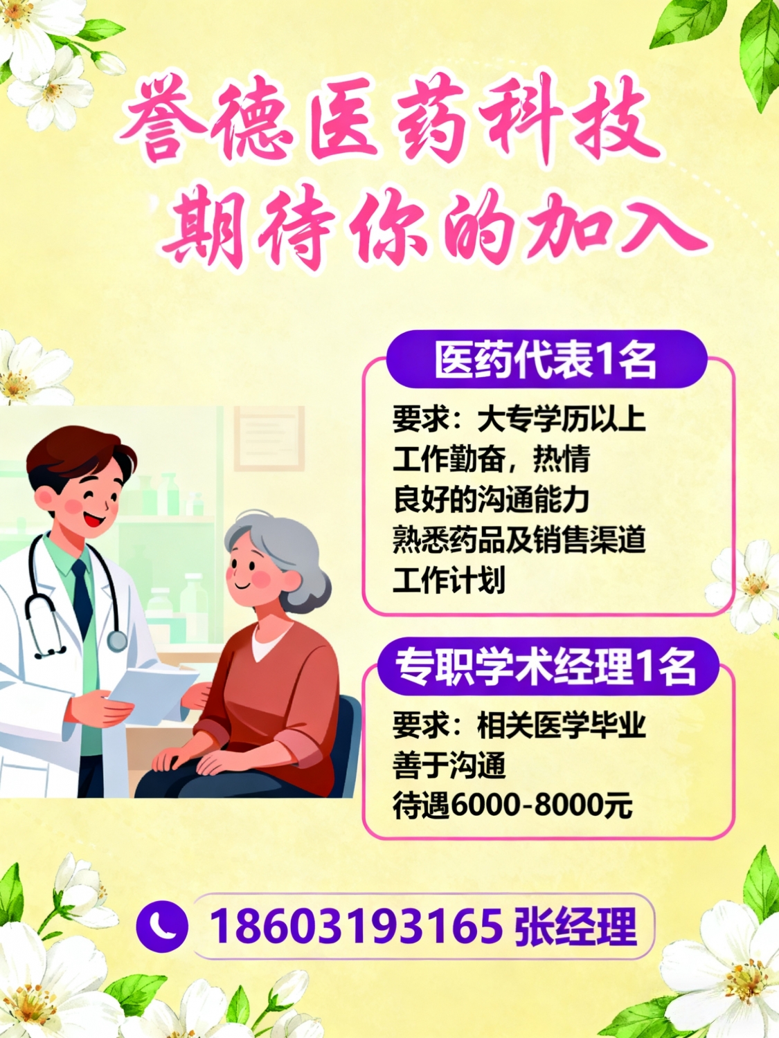 誉德医药科技公司诚聘医药代表1名要求:大专学历以上,工作勤奋,热情;良好...