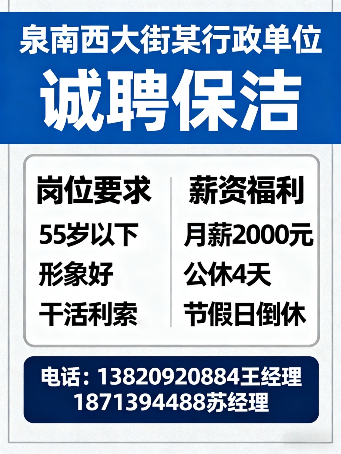 泉南西大街某行政单位诚聘保洁要求:55岁以下,形象好,干活利索,月薪2000元,公休4天,节假日倒休电话:*****0884王经理 *****4888苏经理
