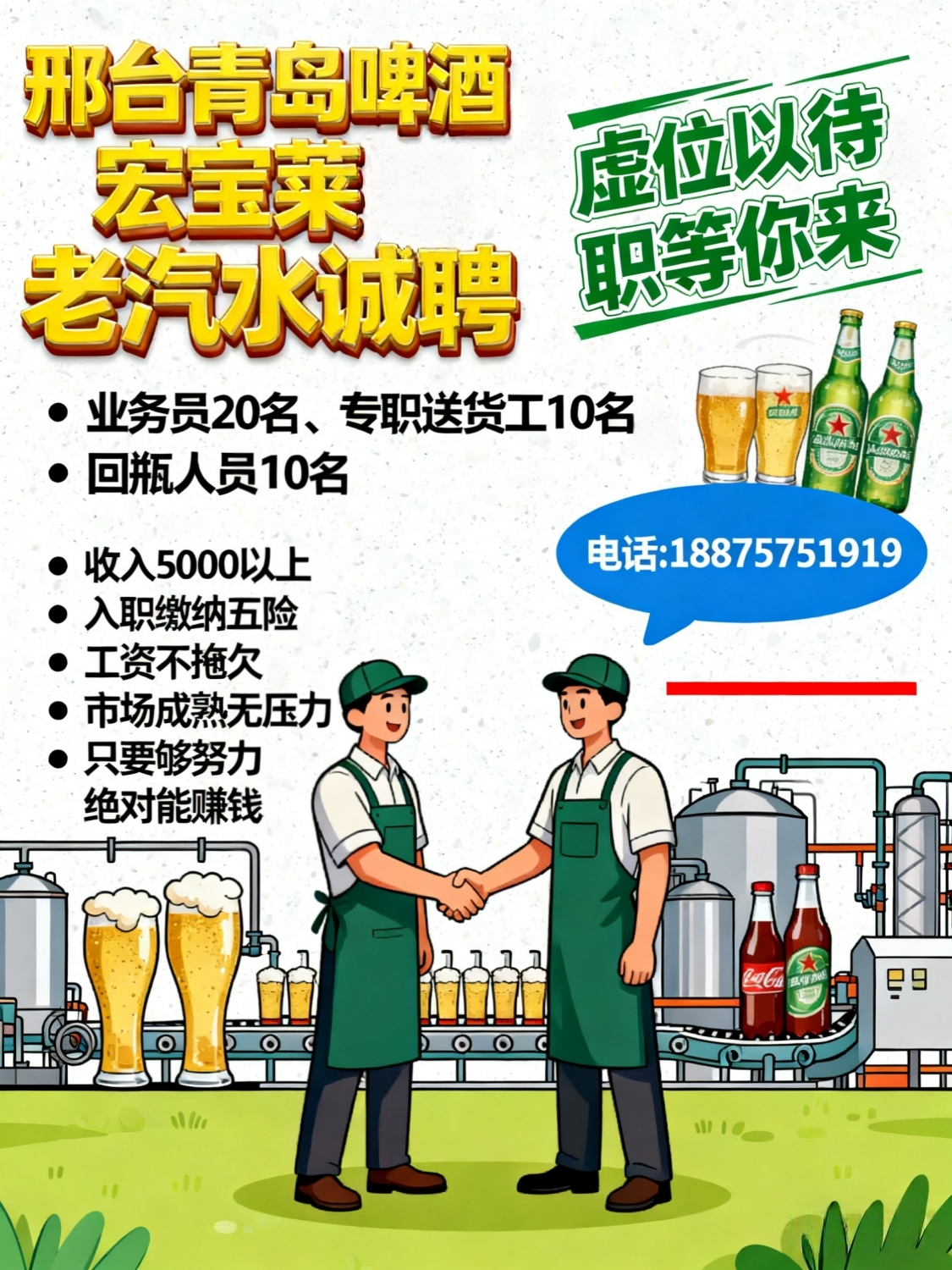 邢台青岛啤酒、宏宝莱老汽水诚招业务员20名专职送货工10名回瓶人员10名收入...