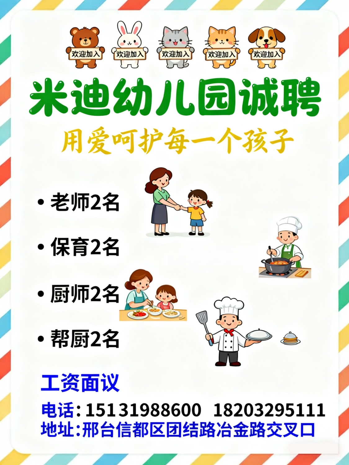米迪幼儿园招聘老师2名保育2名厨师2名帮厨2名工资面议地址:邢台信都区团结...