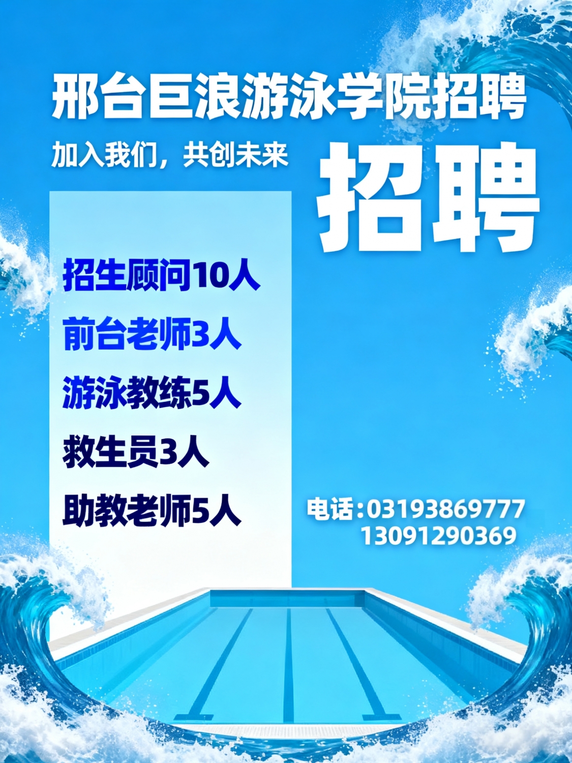 邢台巨浪游泳学院招聘招生顾问10人前台老师3人游泳教练5人救生员3人助教老...