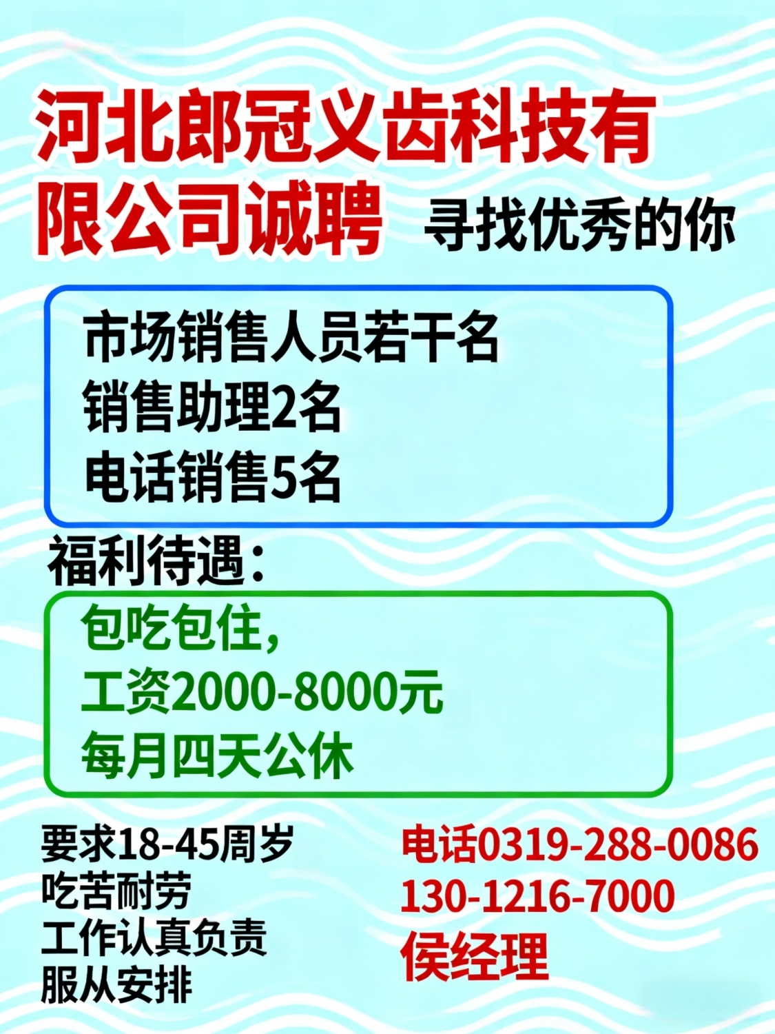 河北郎冠义齿科技有限公司诚聘市场销售人员 若干名销售助理 2名电话销售 5...
