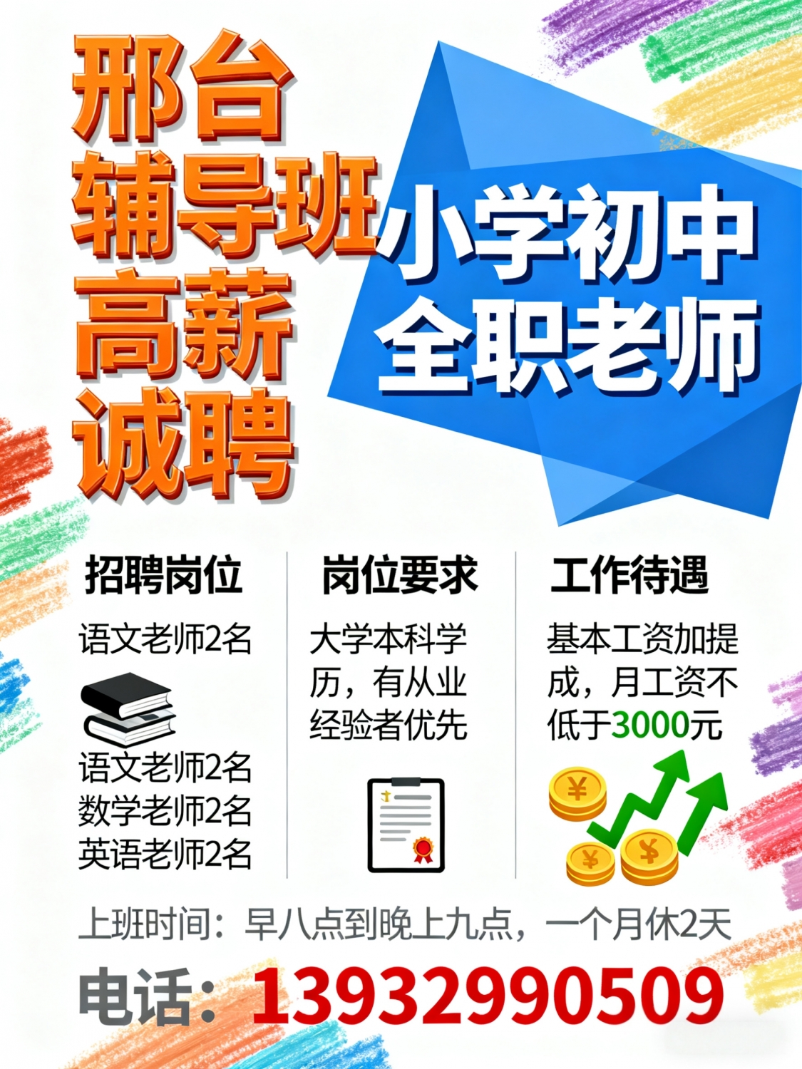 邢台某辅导班高薪诚聘小学初中全职老师语文老师2名数学老师2名英语老师2名...