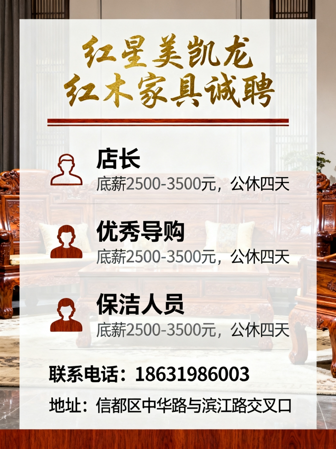 红星美凯龙红木家具诚聘店长优秀导购底薪2500-3500元公休四天保洁人员电话...