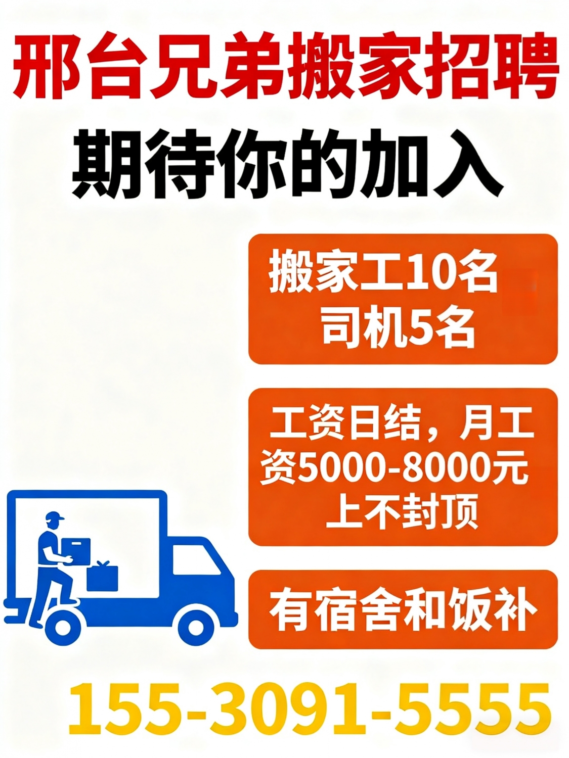 邢台兄弟搬家招聘搬家工10名司机5名工资日结月工资5000-8000元,上不封顶有...