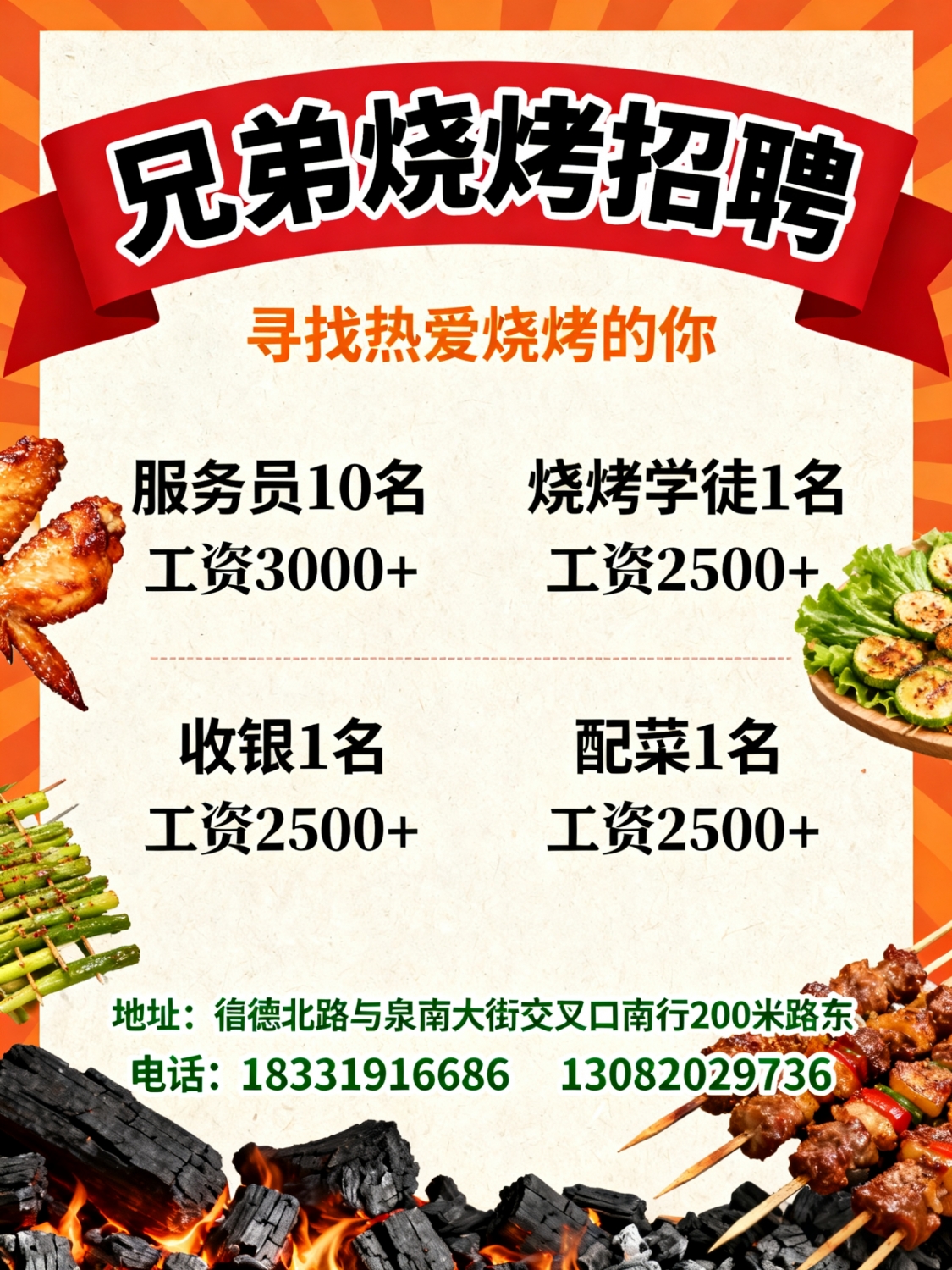 邢台左岸春天北区对过兄弟烧烤招聘服务员10名,工资3000+收银1名,工资2500...