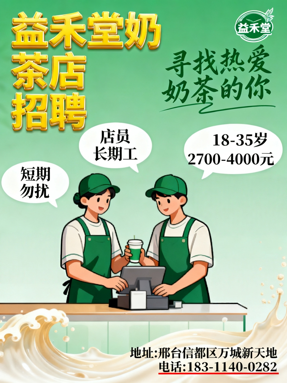 益禾堂奶茶店招聘店员长期工18-35岁2700-4000元短期勿扰电话:*****9383...