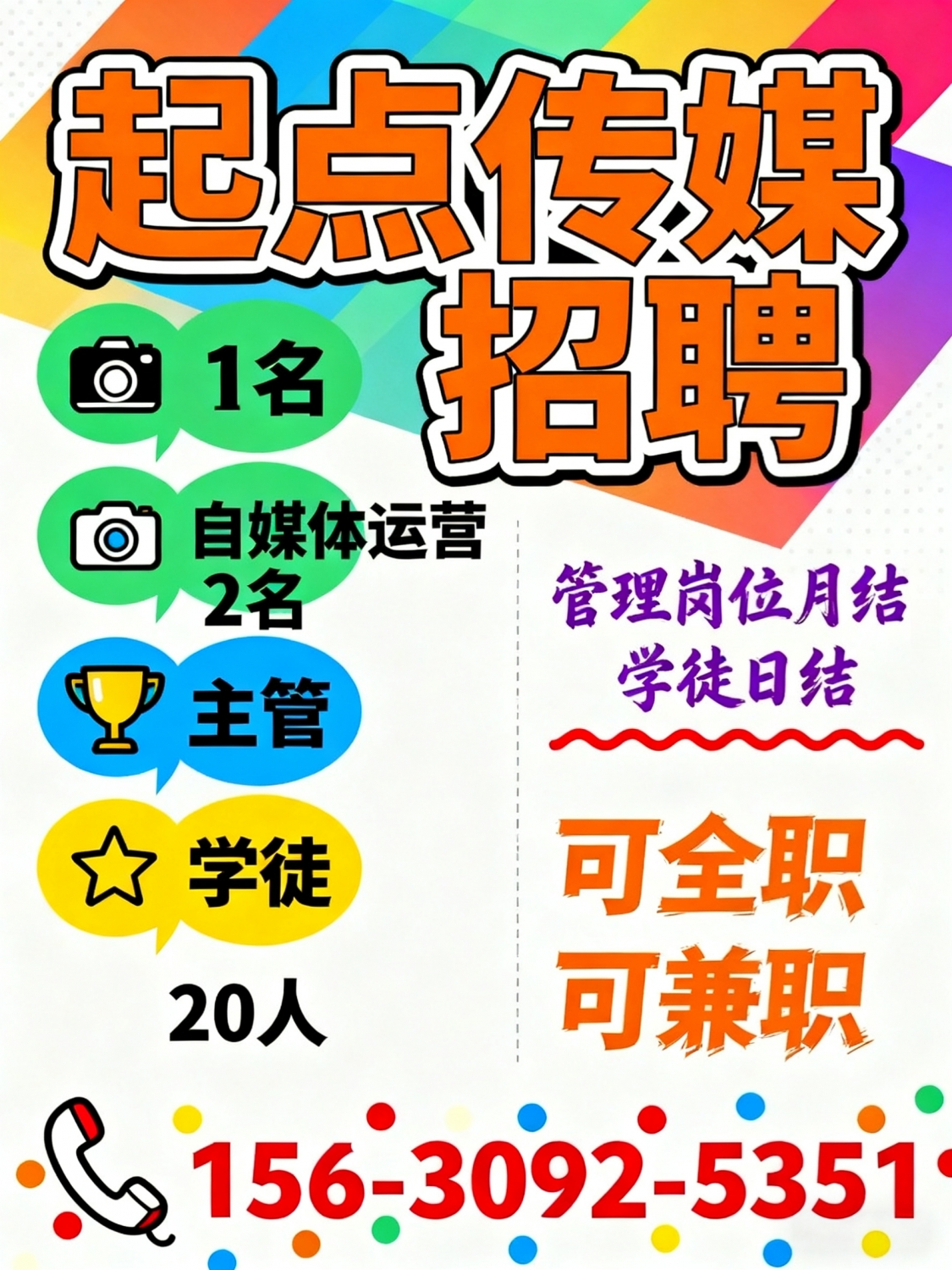 起点传媒招聘自媒体运营1名主管2名学徒20人工资管理岗位月结学徒日结,可全...
