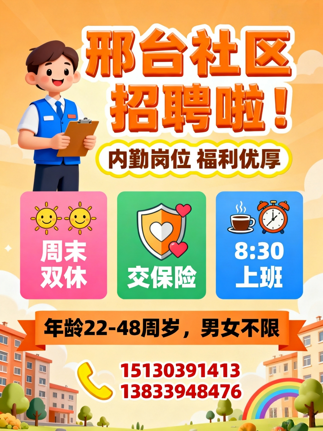 邢台市招聘社区服务管理内勤周末双休,交保险,工作时间:8:30上班年龄22-48...