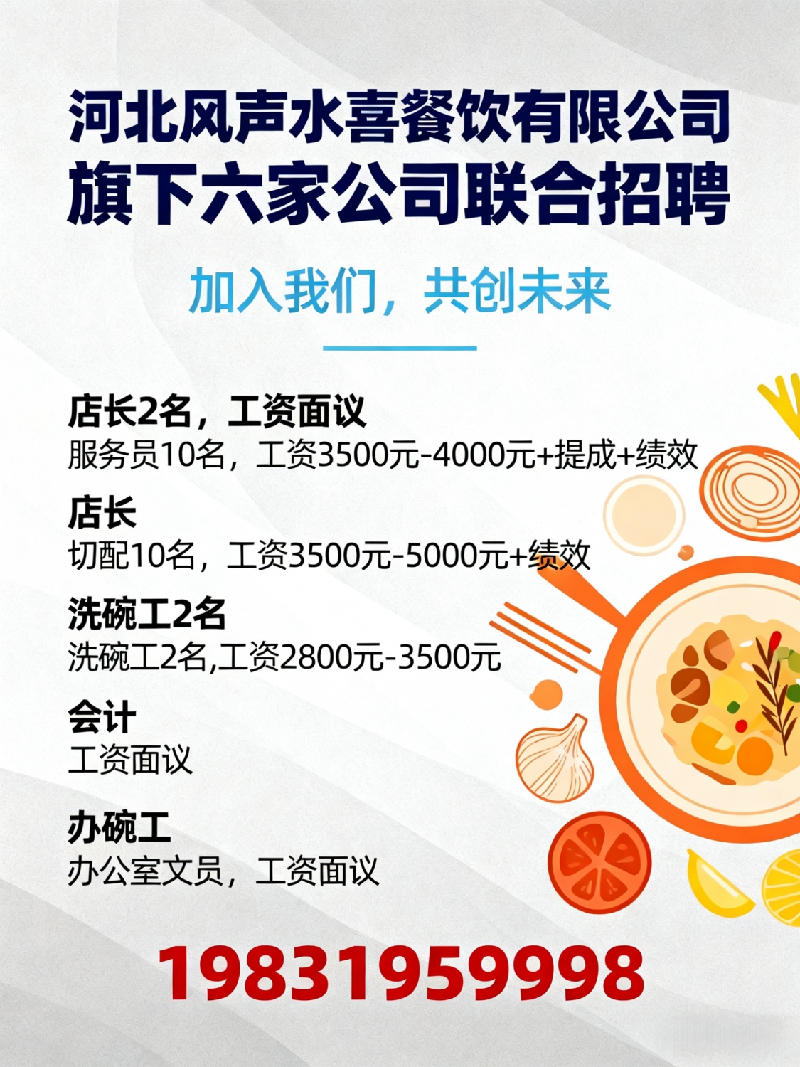 河北风声水喜餐饮有限公司旗下六家公司招聘店长2名,工资面议服务员10名,...