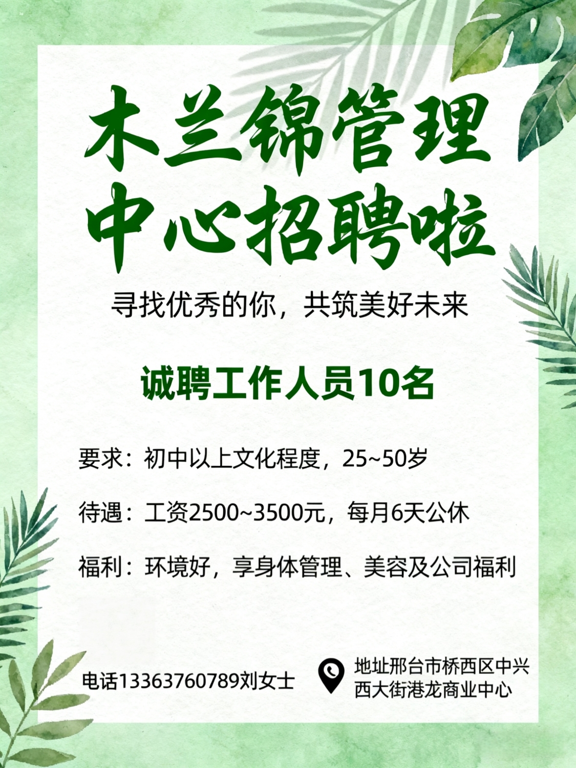 木兰锦管理中心诚聘工作人员10名初中以上文化程度,25~50岁,工资待遇:2500...