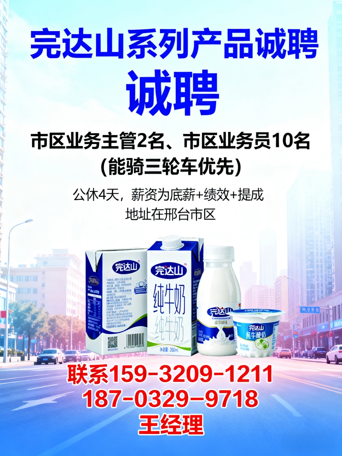 邢台市区完达山系列产品诚聘市区业务主管 2名市区业务员10名能骑三轮车优先...