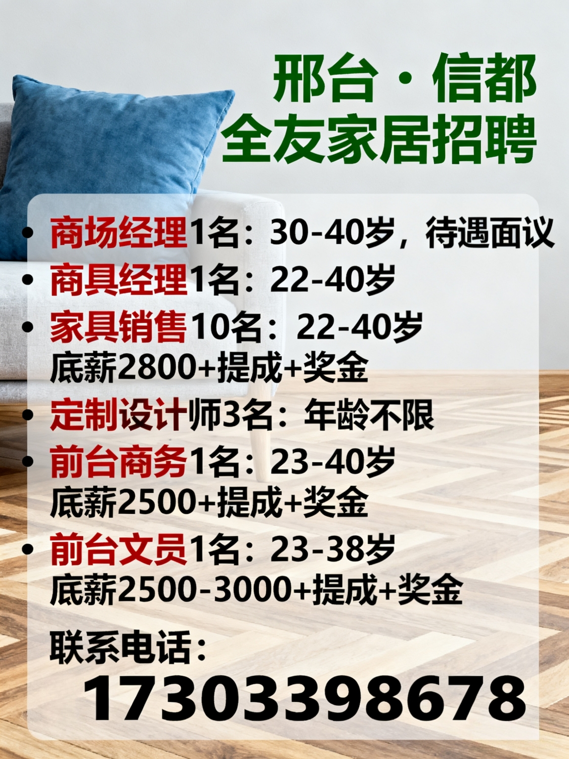 邢台·信都 全友家居招聘会商场经理1名,年龄30-40岁,职位待遇:面议家具销售10名,22-40岁,底薪2800+提成+奖金定制设计师3名,年龄不限,底薪3300+提成+奖金前台商务1名,年龄23-40岁,底薪2500+提成+奖金前台文员1名,年龄23-38岁,底薪2500-3000+提成+奖金地址:莲池大街与兴达路交叉口东行50米路南电话:*****8678