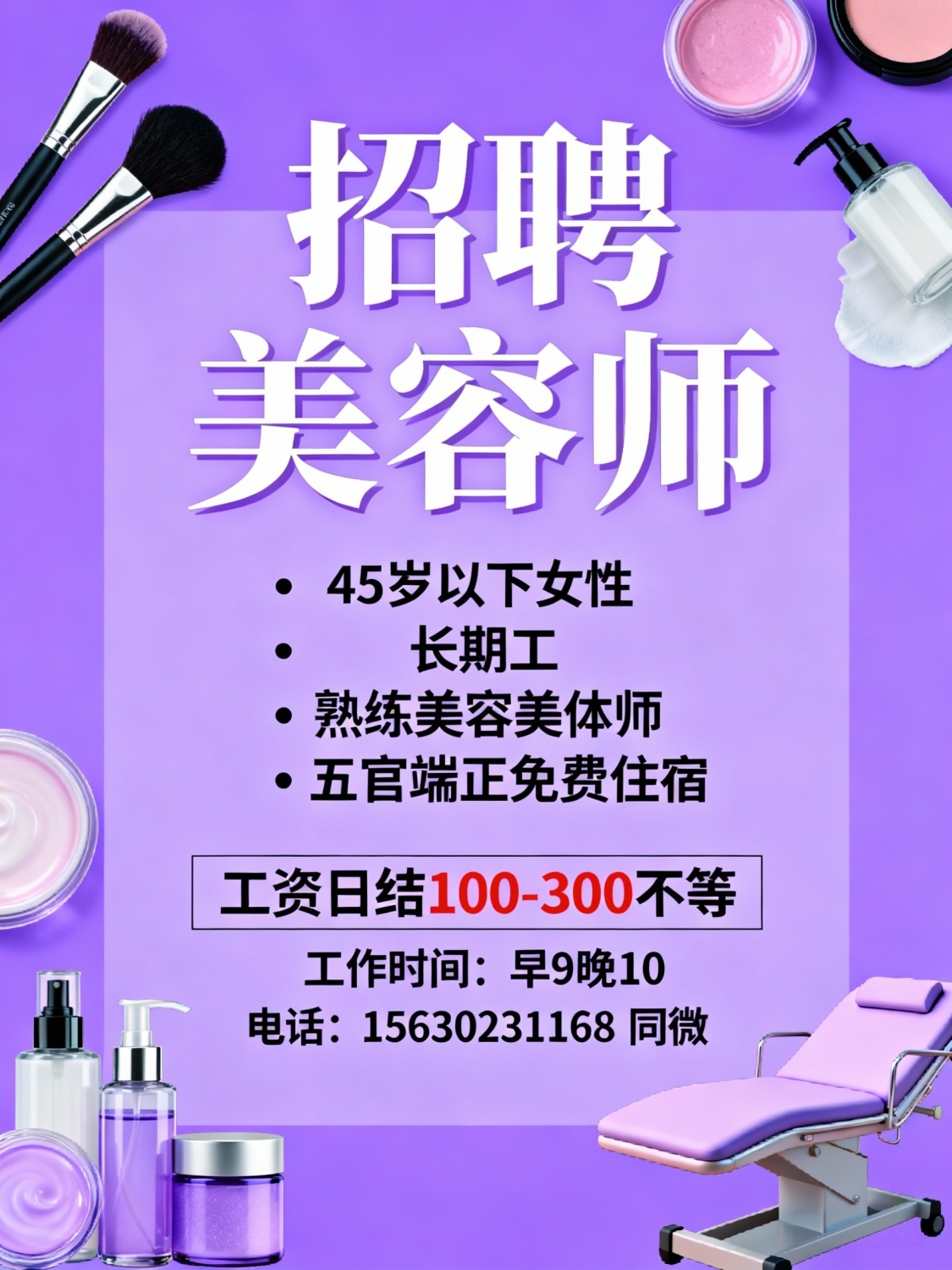 招聘美容师要求:45岁以下女性,长期工熟练美容美体师,五官端正免费住宿工资日结100-300不等工作时间早9晚10电话:*****1168 同微