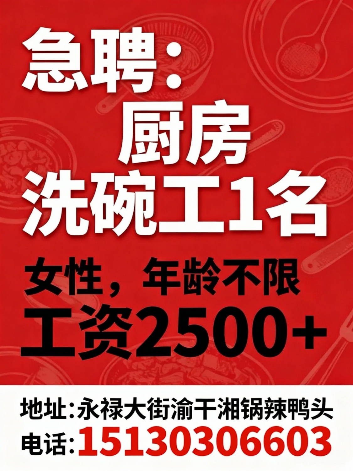 急聘:厨房洗碗工1名要求:女性,年龄不限,工资2500+地址:永禄大街渝干湘...
