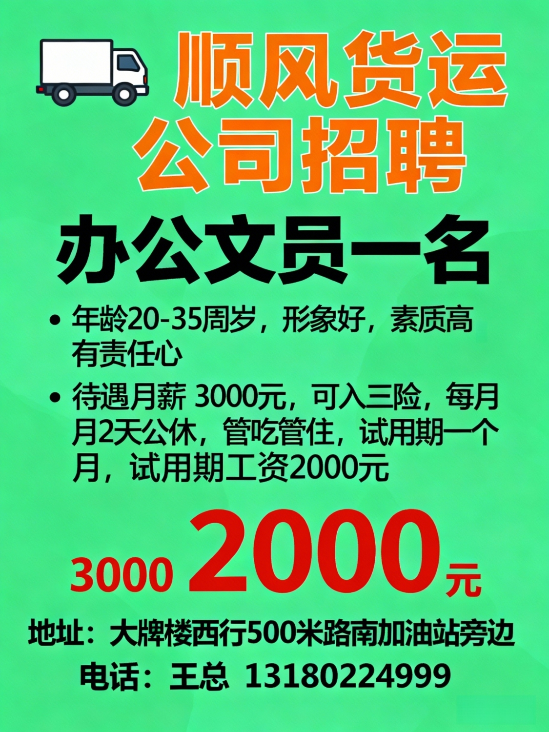 顺风货运公司招办公文员一名要求:年龄20-35周岁,形象好,素质高,有责任...