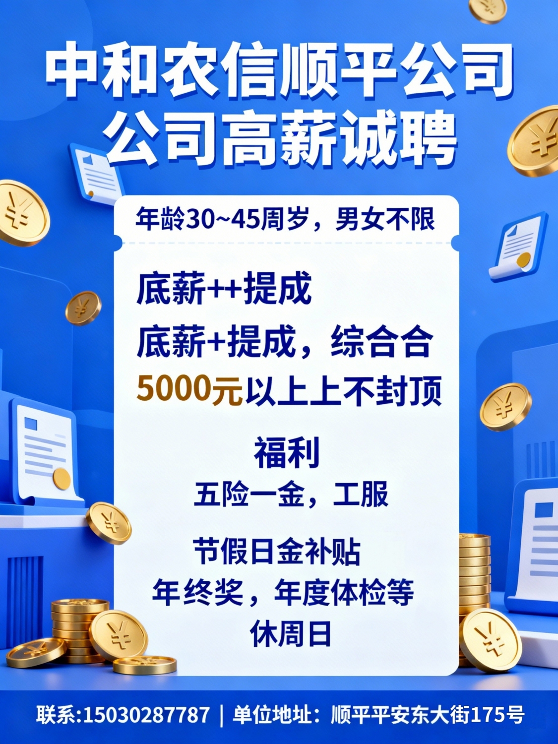 中和农信顺平分公司高新诚聘 年龄30~45周岁,男女不限工资:底薪+提成=500...
