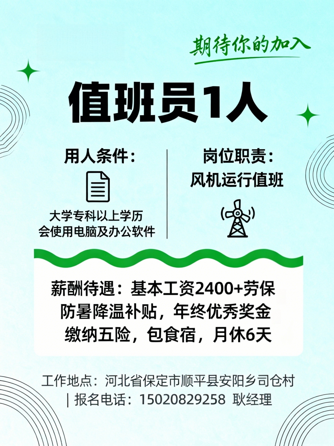 用人岗位 值班员1人用人条件大学专科以上学历,会使用电脑及办公软件岗位职...