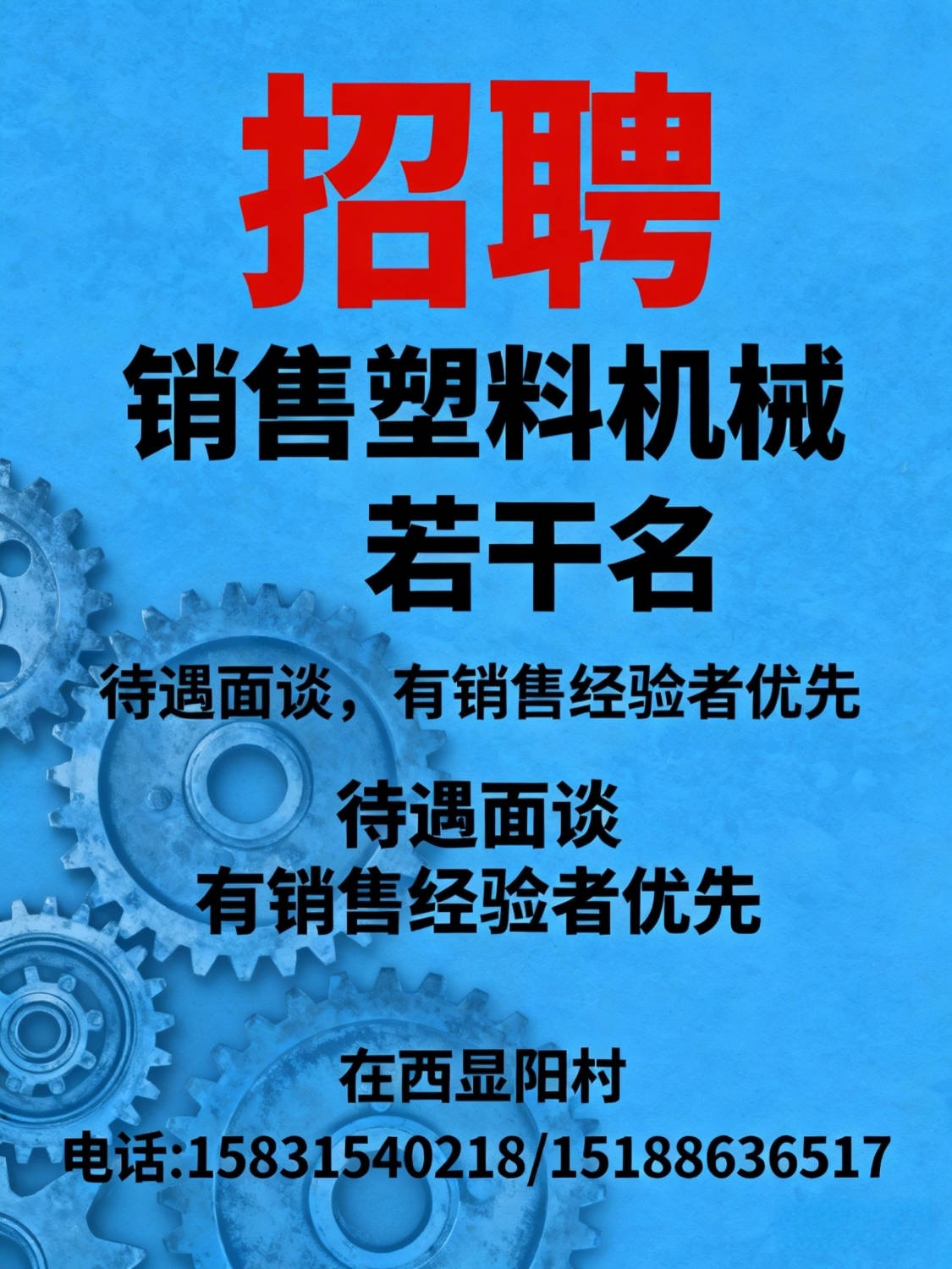 招聘销售塑料机械若干名待遇面谈,有销售经验者优先地址:在西显阳村电话:***************7
