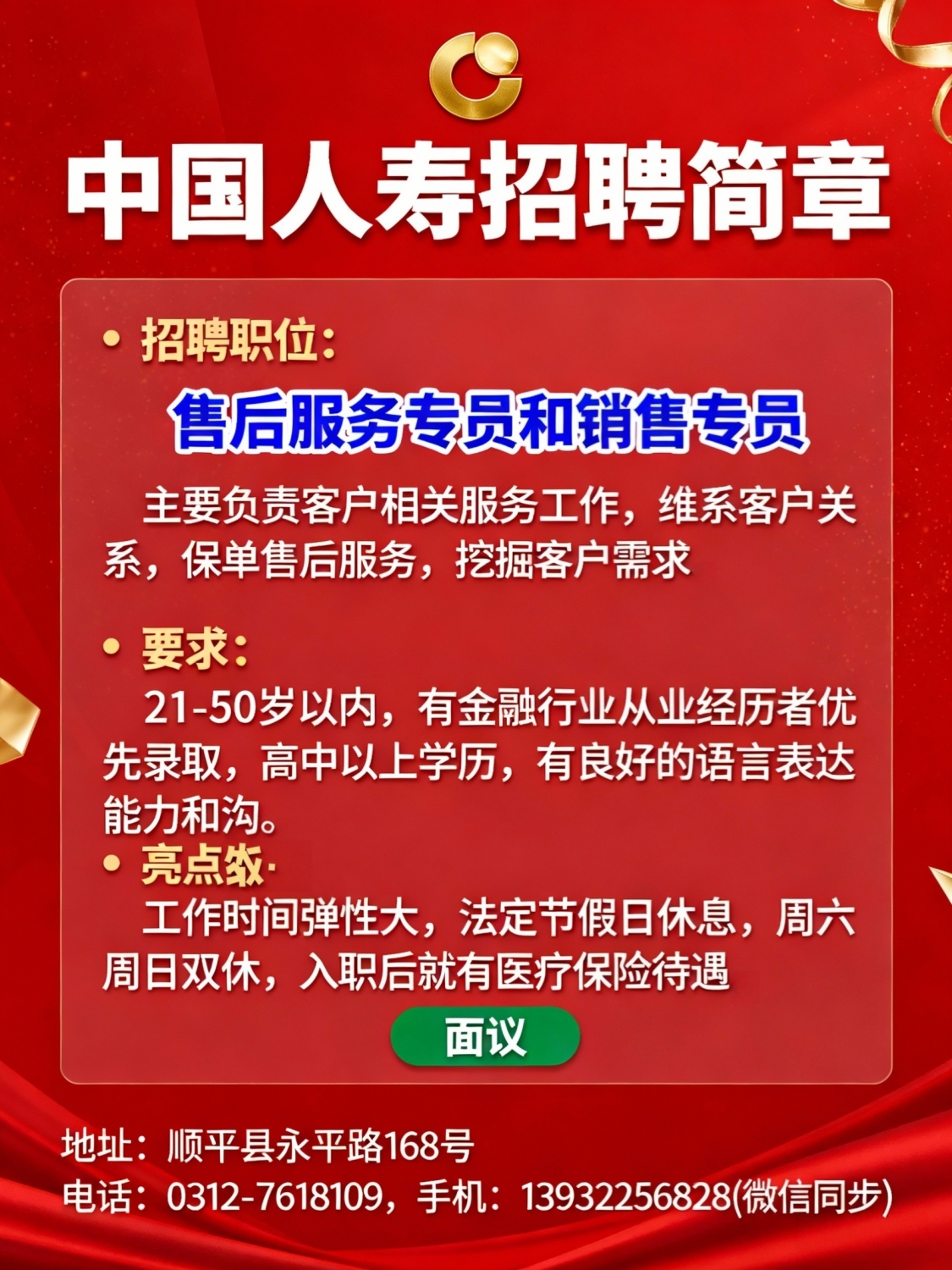 中国人寿招聘简章招聘:售后服务专员和销售专员职责:主要负责客户相关服务工作,维系客户关系保单售后服务,挖掘客户需求要求:21-50岁以内;年有金融行业从业经历者优先录取高中以上学历;有良好的语言表达能力和沟通能力学习能力强,敬业精神,服从公司制度管理。亮点:工作时间弹性大,法定节假日休息周六周日双休,入职后就有医疗保险待遇薪资:面议地址:顺平县永平路168号电话:0312-*****手机:*****6828(微信同步)