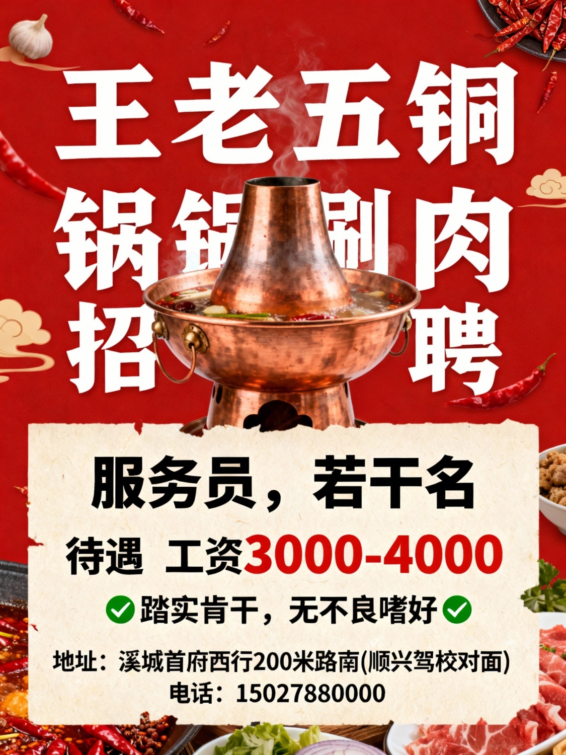 王老五铜锅涮肉招聘服务员,若干名,工资3000-4000要求踏实肯干,无不良嗜...