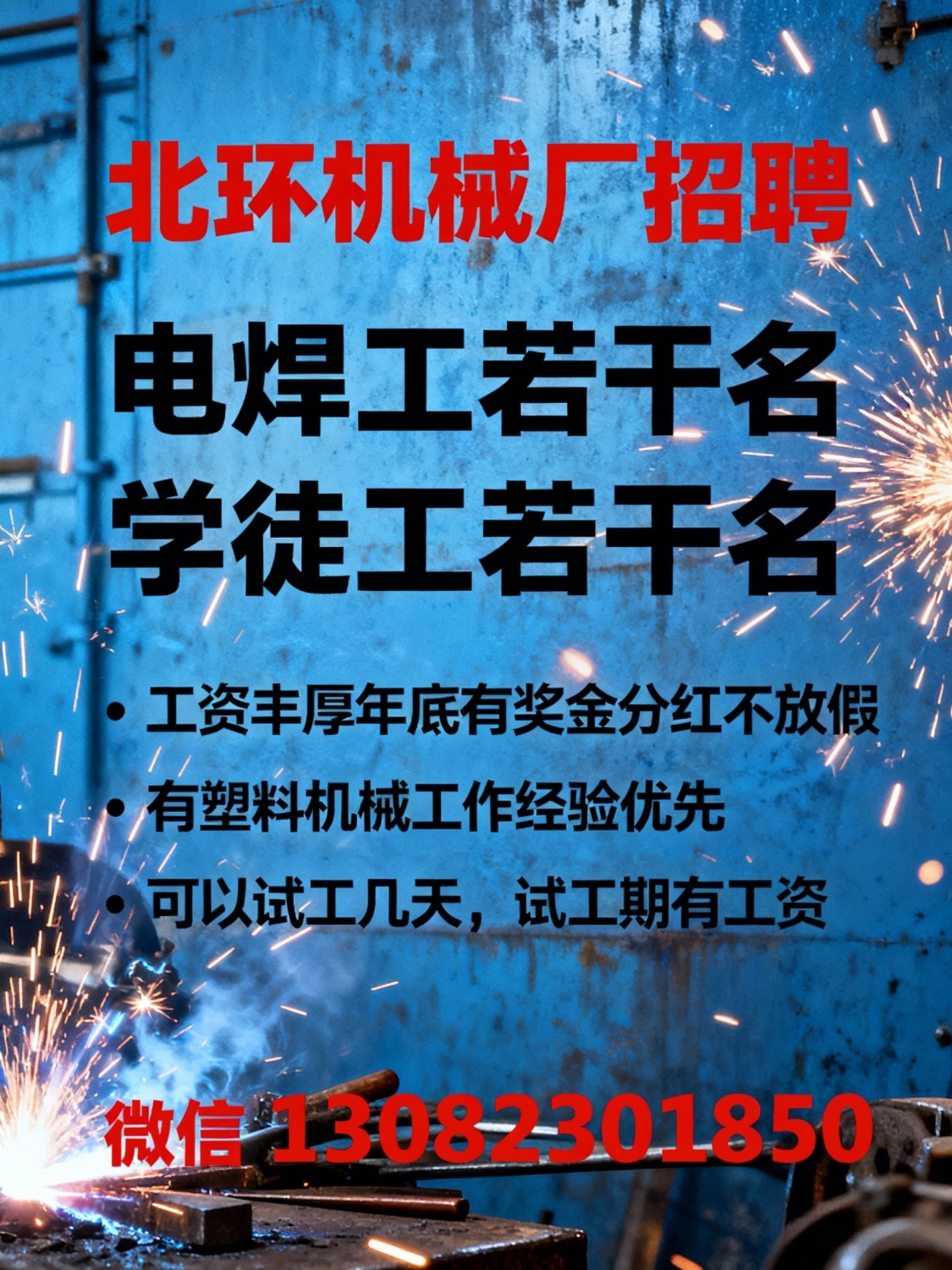北环机械厂招聘电焊工若干名学徒工若干名工资丰厚年底有奖金分红不放假有塑...