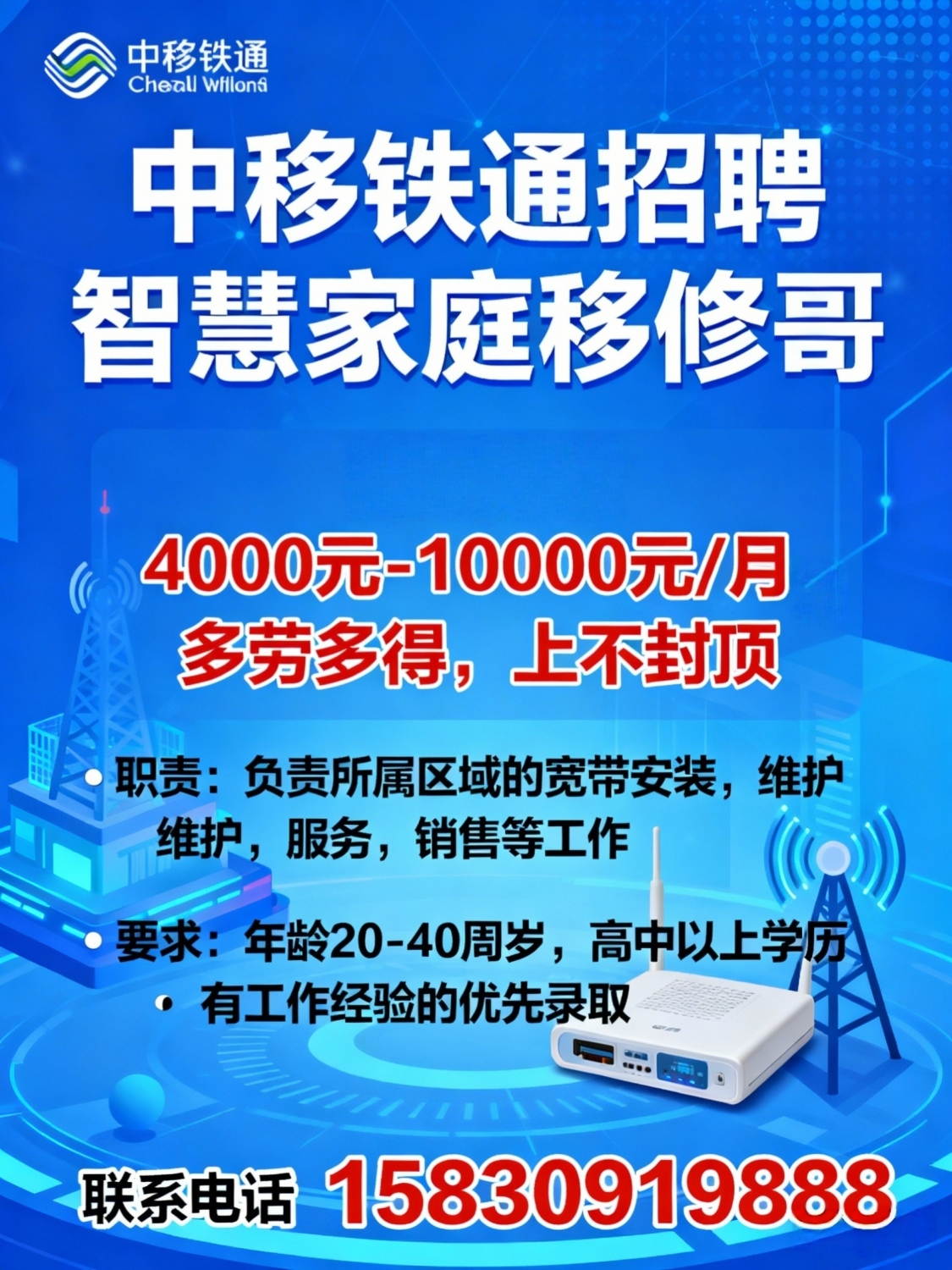 中移铁通招募智慧家庭移修哥: [薪资待遇]4000元-10000元/月多劳多得,上不...