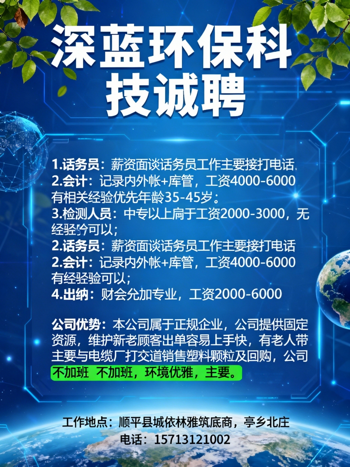 深蓝环保科技诚聘1.话务员:薪资面谈话务员工作主要接打电话2.:会计:记录内外帐+库管 工资4000-6000有相关经验优先年龄35-45岁3.检测人员:中专以上学历工资2000-3000无经验也可以4.出纳:财会相关专业 工资2000-3000本公司属于正规企业,公司提供固定资源,维护新老顾客出单容易上手快;有老人带;本公司主要与电缆厂打交道销售塑料颗粒及回购,公司不加班不加班, 公环境优雅。话务员工作地点:顺平县城依林雅筑底商会计 出纳 检测人员工作地点:亭乡北庄电话:*****1002