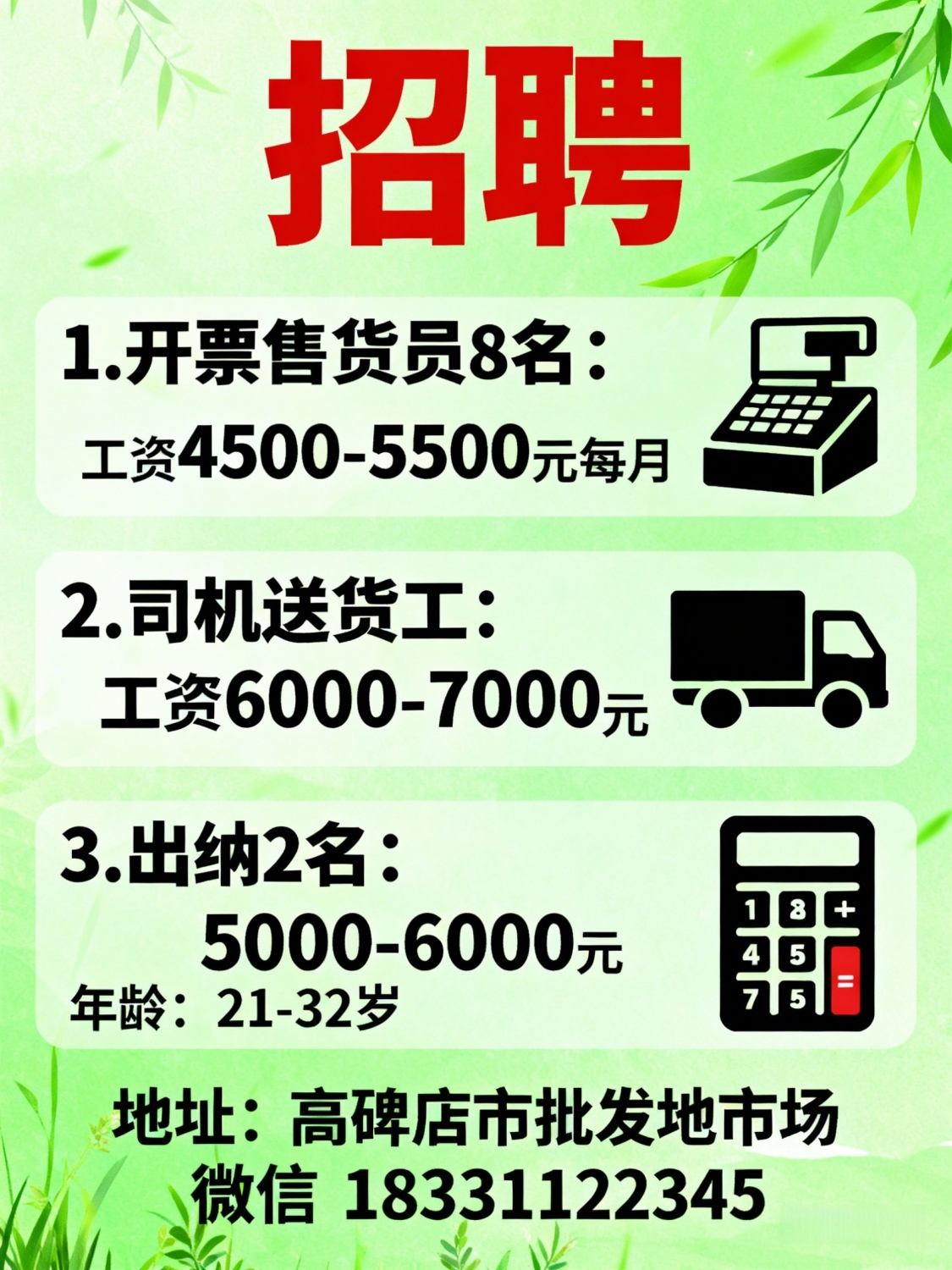 招聘:1.开票售货员8名,工资4500-5500元每月。2.司机送货员,工资6000-700...