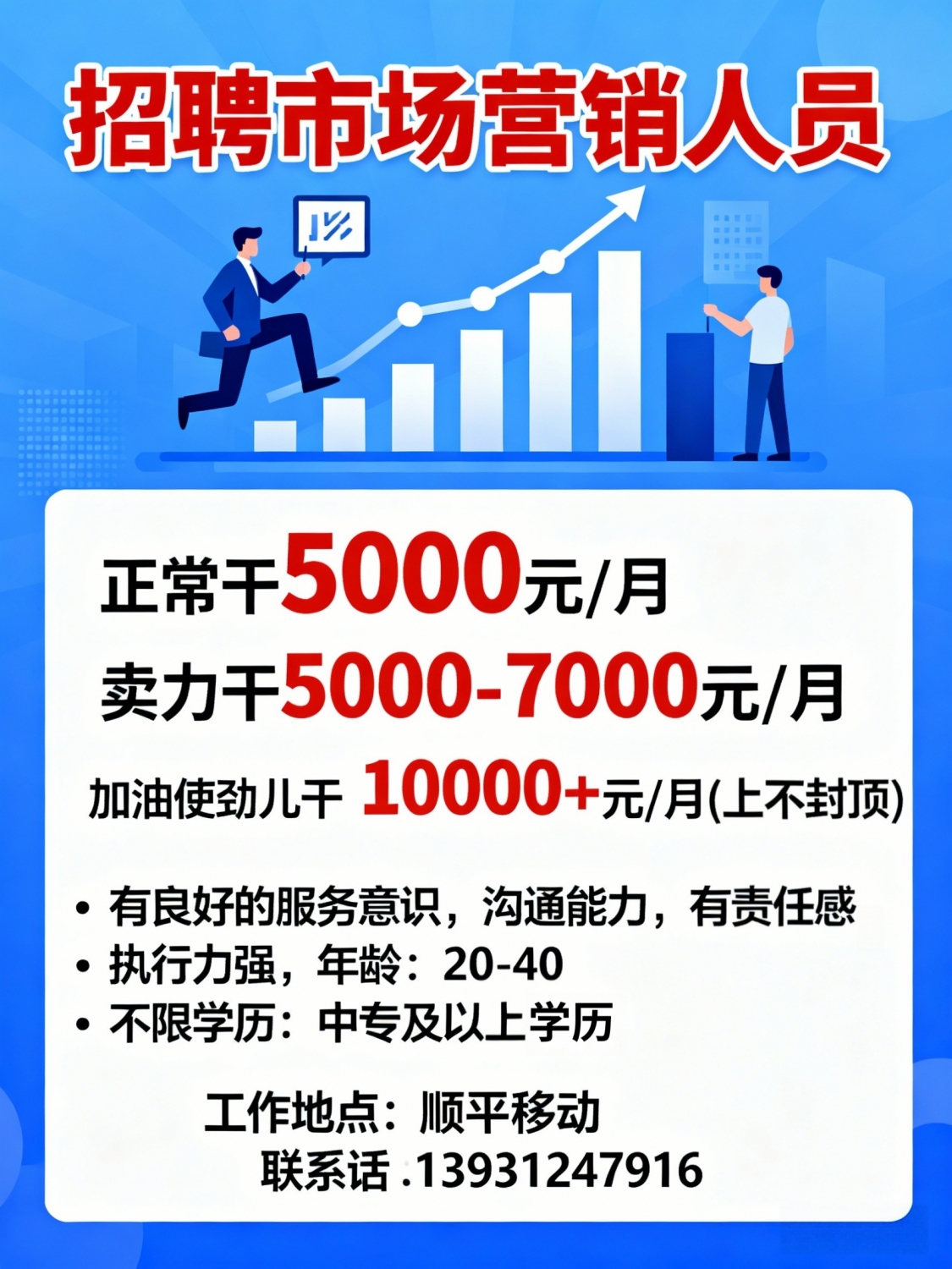 招聘移动客服30名,有工作经验优先[岗位薪资]:底薪3000+提成元/月,月均收入4000-7000,工作时间9:00-12:00,下午1:30-6:00,每周六日选择调休一天,入职半年上五险。每月公司安排团建,聚餐,法定节假日,工作简单,轻松不累,三个月晋升制,入职半年优秀员工公司安排旅游[岗位要求]:年龄20~40以内,女性[工作内容]本公司有正规线下实体营业厅,线上线下强强联合,移动工单的录入,系统的使用,移动业务的销售,对接移动客户,移动客户的回访。联系电话:*****9907工作地址:顺平林江商厦五楼