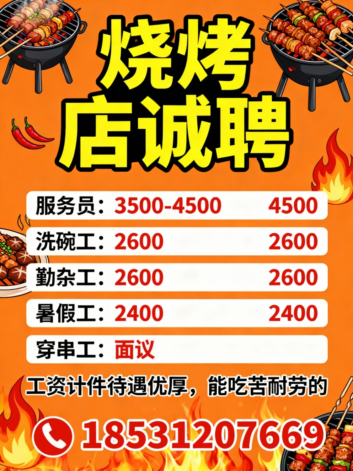 烧烤店诚聘1.服务员:3500-45002.洗碗工:26003.勤杂工:26004.招暑假工:2...